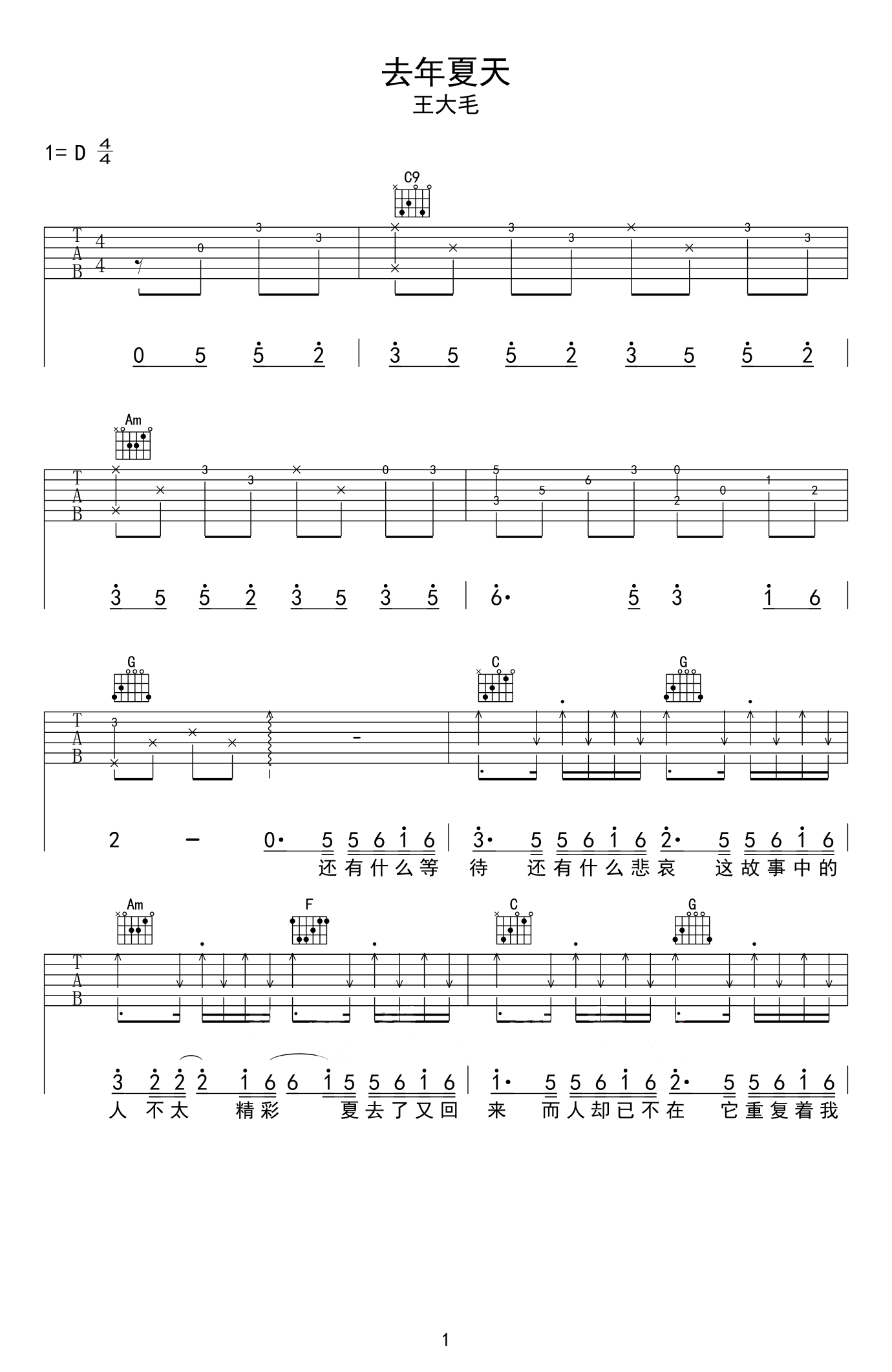 去年夏天吉他谱 - 王大毛 - 吉他弹唱谱