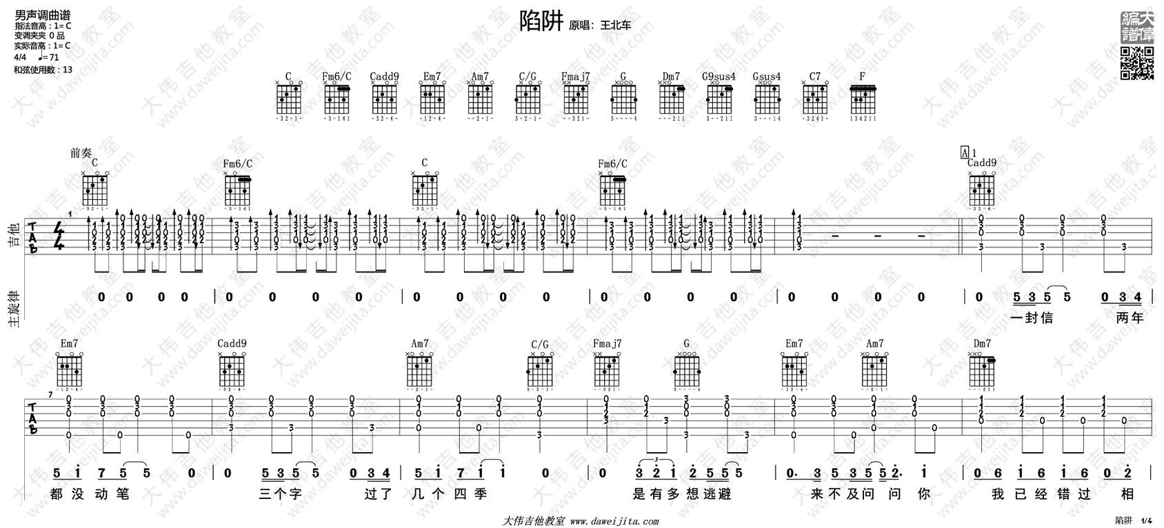 曲谱介绍: 陷阱吉他谱,王北车演唱的一首热门网络歌曲,男生调曲谱,C调原调音高编配,陷阱六线谱,四张高清图片谱,同学们可以点击图片谱看大图浏览,感谢大伟吉他编配,并分享歌曲的吉他弹唱示范视频,琴谱网上传推荐。
