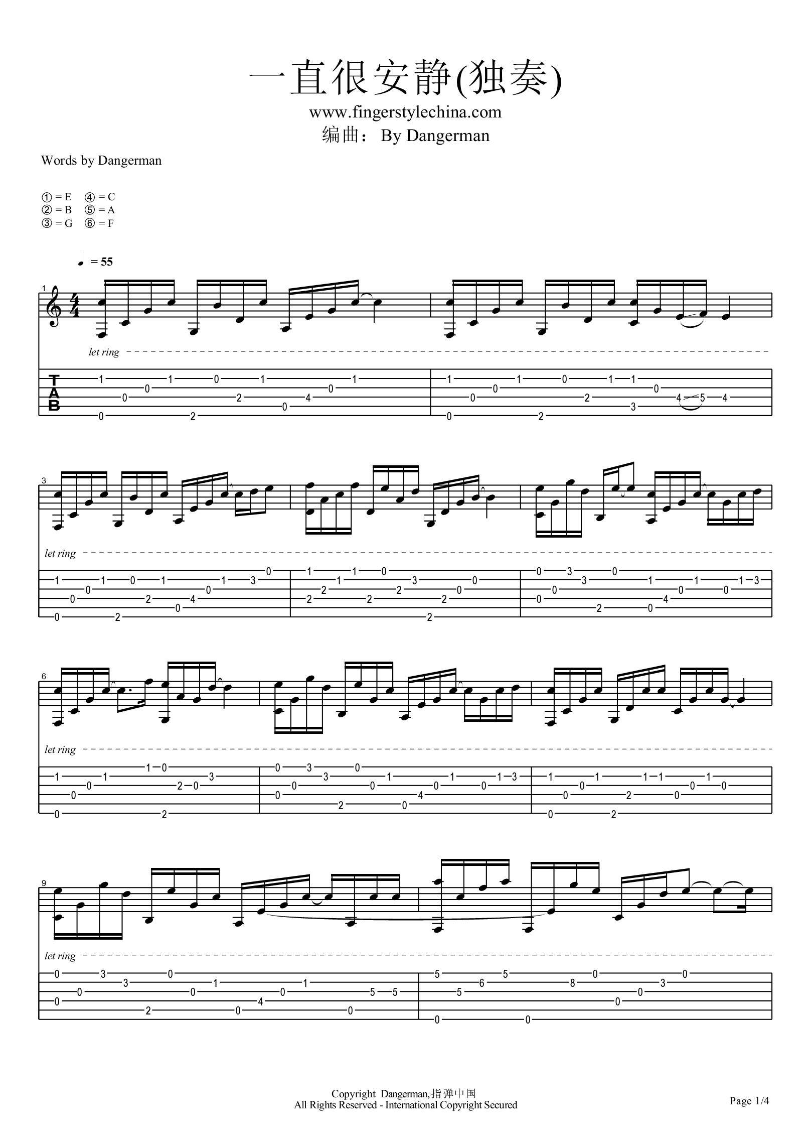 曲谱介绍: 一直很安静指弹吉他谱,阿桑的经典情歌改编,一直很安静吉他指弹独奏曲,Dangerman指弹编曲改编版本,琴谱网整理分享。 重温了阿桑的「一直很安静」,原曲旋律里的淡淡忧伤,听过一次就不会忘。吉他指弹版《一直很安静》,这首歌给人的感觉就像歌名一样,会让人不由自主地宁静,隐有悲伤,却又觉得治愈。