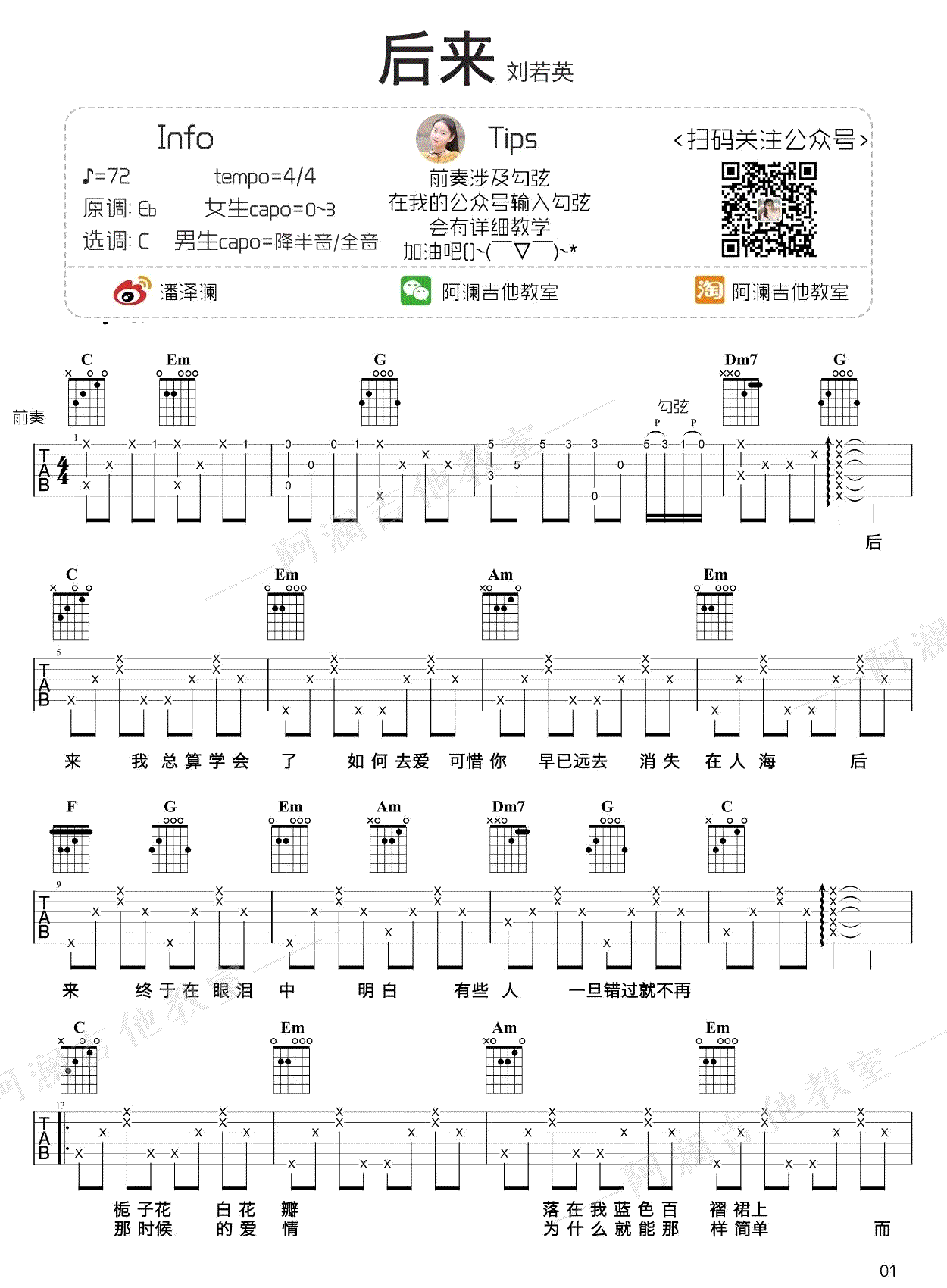 曲谱介绍: 刘若英《后来》吉他谱,原调Eb,选调C,女生CAPO0-3品,男生如果感觉太高可以降半音或全音,刘若英的经典歌曲,后来六线谱,三张图片谱子,演奏提示,前奏涉及勾弦技巧,阿澜吉他教室编配,并带来歌曲的吉他弹唱教学。