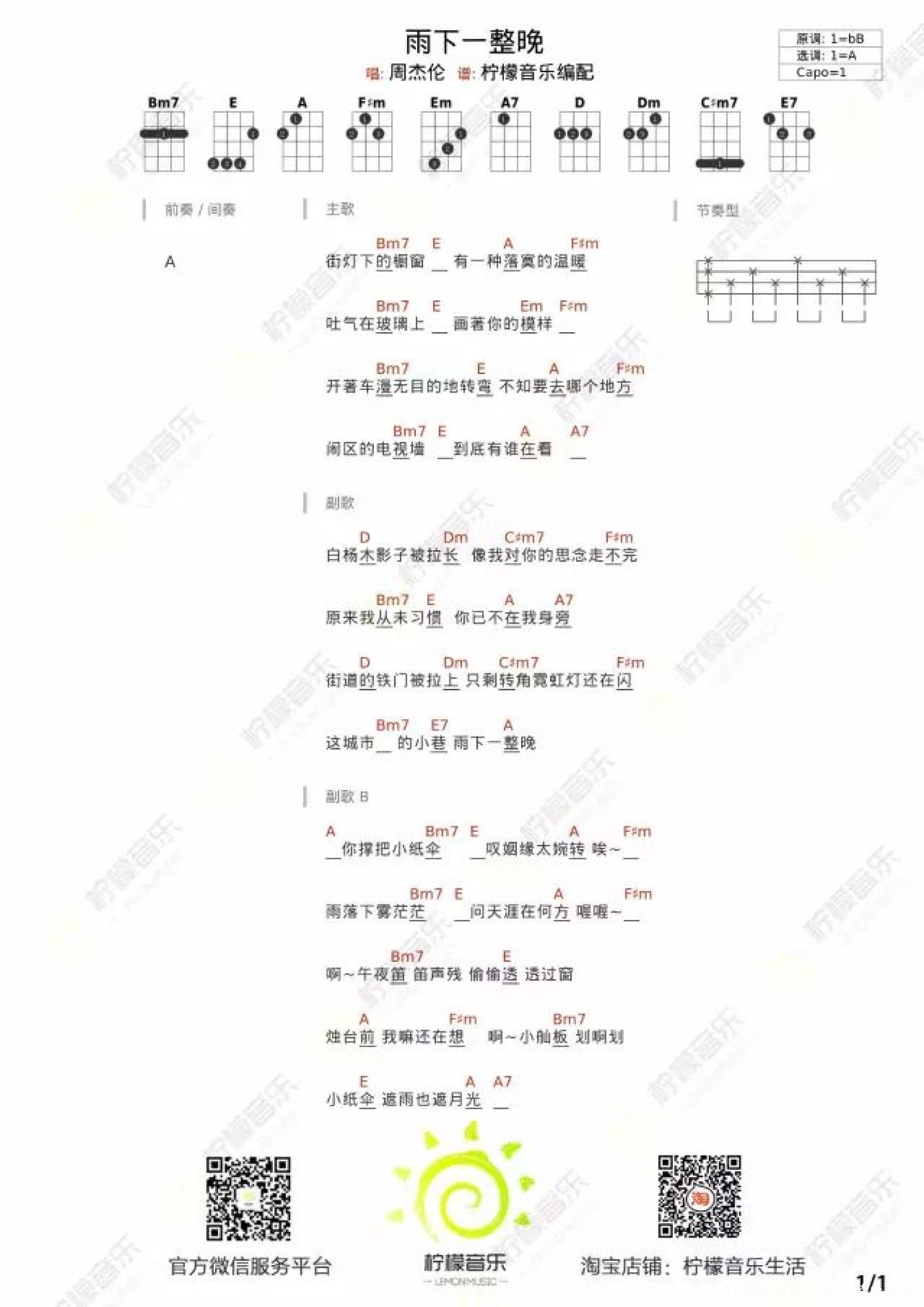 曲谱介绍: 雨下一整晚 尤克里里谱