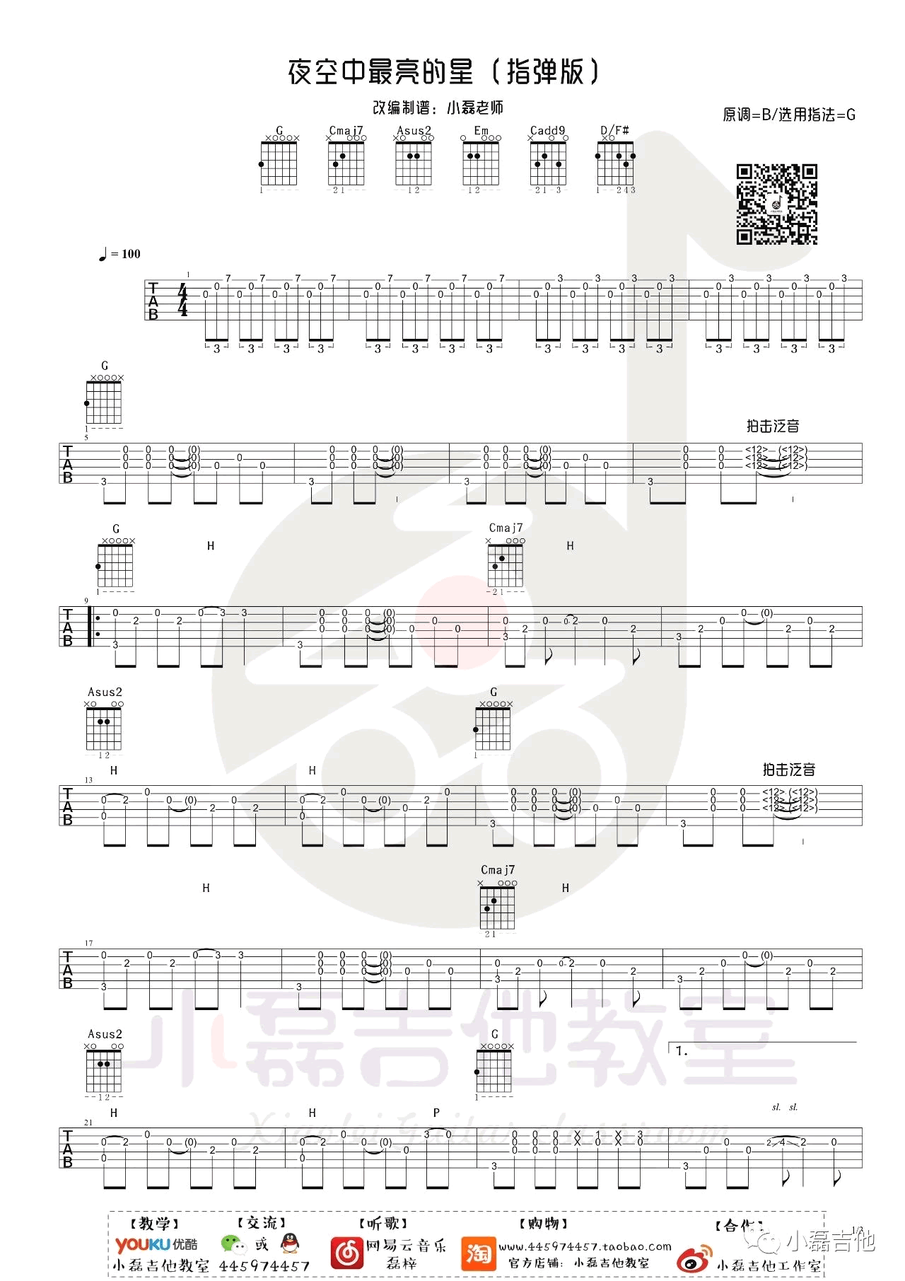 曲谱介绍: 夜空中最亮的星指弹吉他谱,逃跑计划乐队的代表作,这次送上的是吉他指弹乐谱,感谢小磊吉他编配,琴谱网更新上传。老师制作的这个乐谱还是尽可能保留原版的前奏成分,加入了拍击泛音的技巧,对于押尾的风格熟悉的同学肯定不陌生!很多的节奏也需要大家多多理解!后段我们用到了敲击面板的技巧,俗称“PM”,这样的技巧会让演奏更有层次有氛围!类似于打击乐的感觉,所以这一部分也是现代指弹常用的方法,不难但是需要大家练习熟练稳定操作!难度:7级。 吉他指弹演示和教学视频