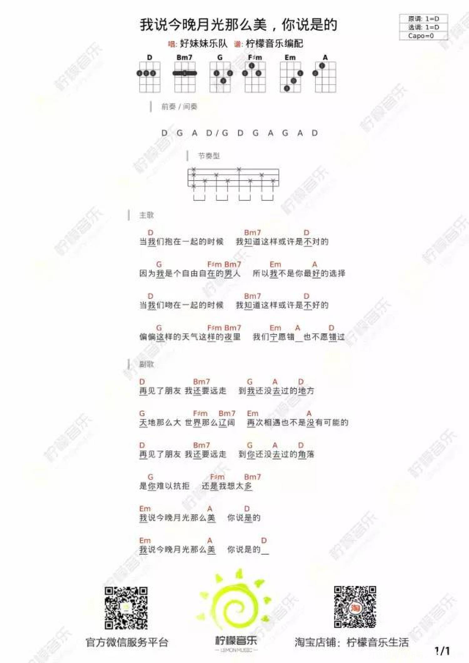 我说今晚月光那么美,你说是的尤克里里谱 - 好妹妹乐队