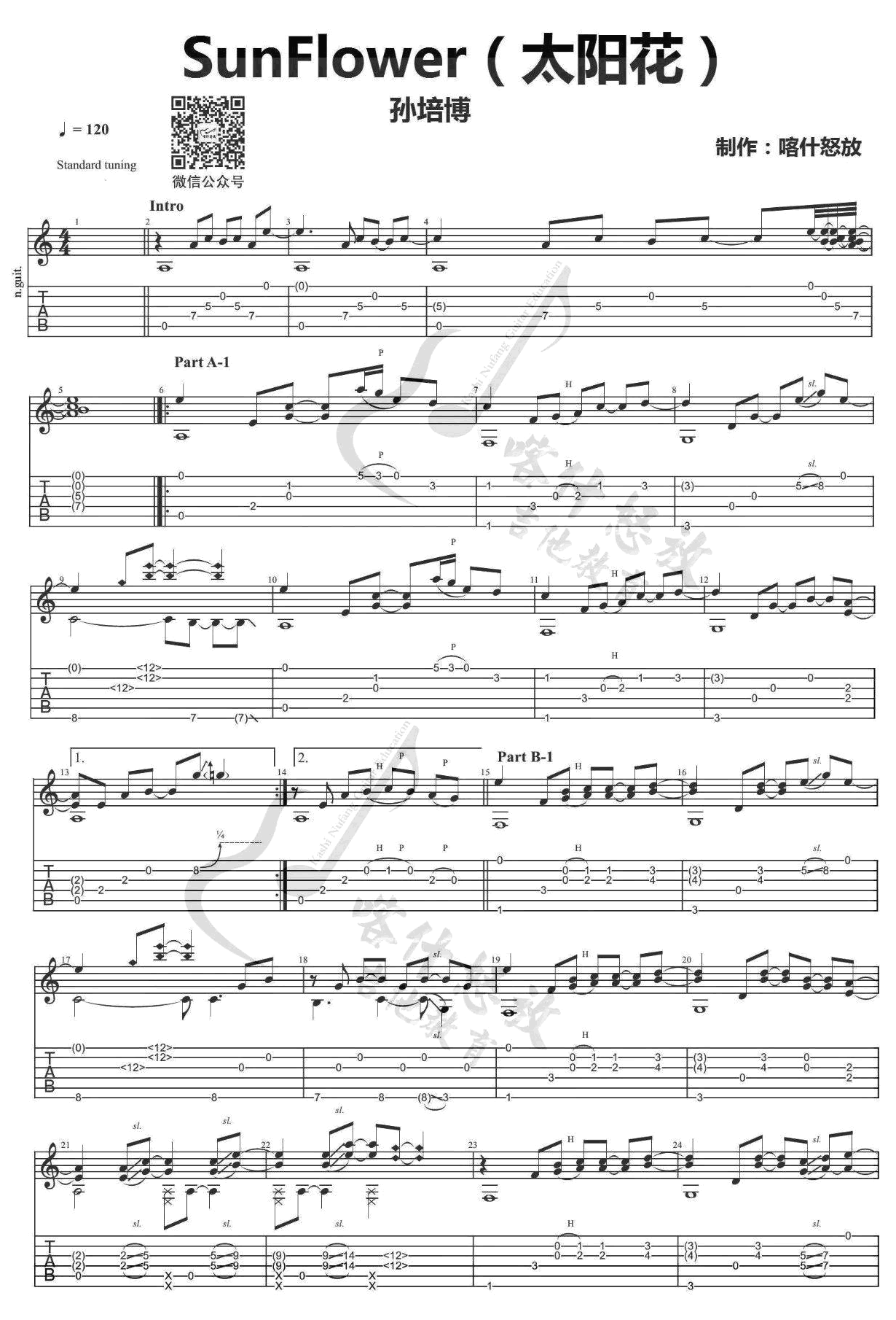 曲谱介绍: Sunflower指弹吉他谱,孙培博的一首原创指弹吉他经典作品,Sunflower太阳花吉他独奏谱,完整版共六张图片谱,感谢喀什怒放编配,琴谱网上传分享。这首大名鼎鼎的孙培博的《Sunflower》不仅在国内广为流传,国外也有不少指弹爱好者翻弹,这里就附上乌克兰指弹高手改编演奏的视频欣赏。