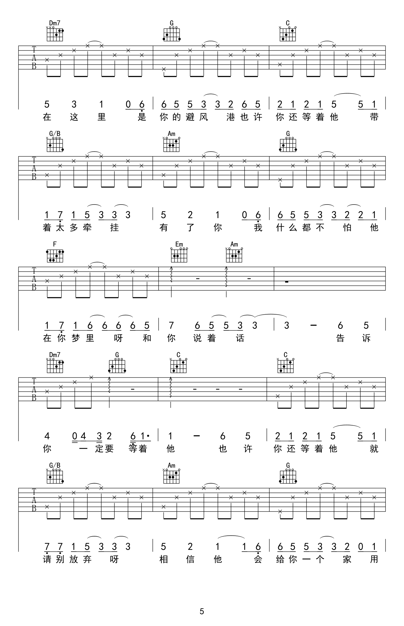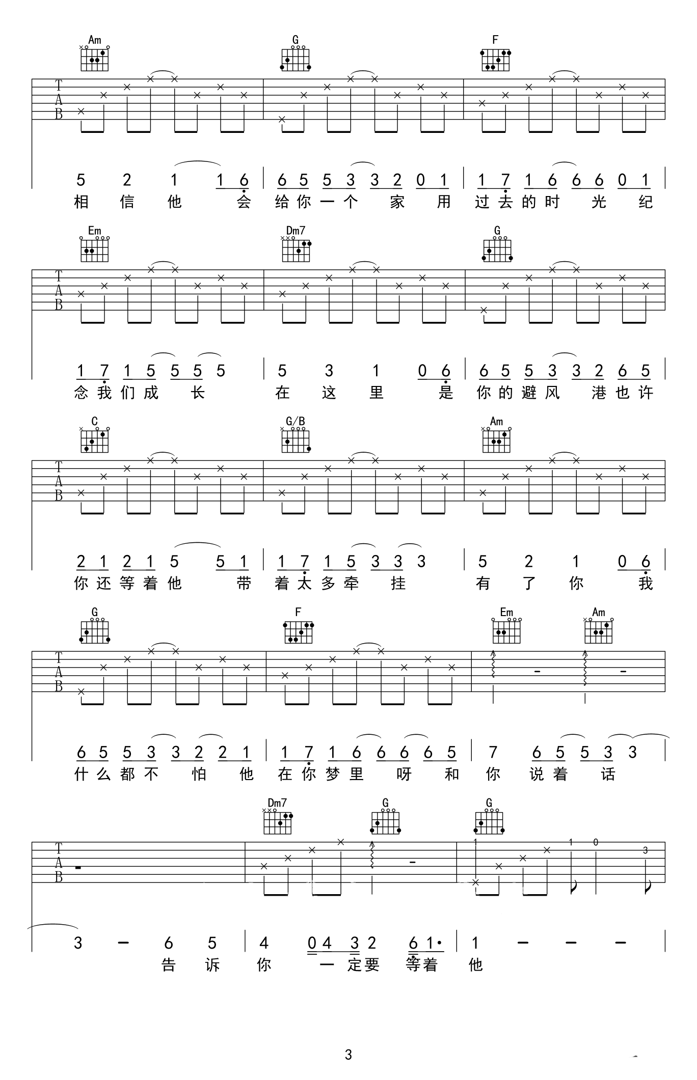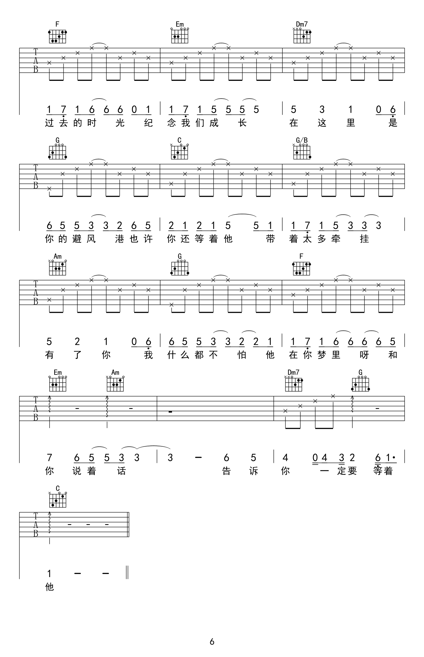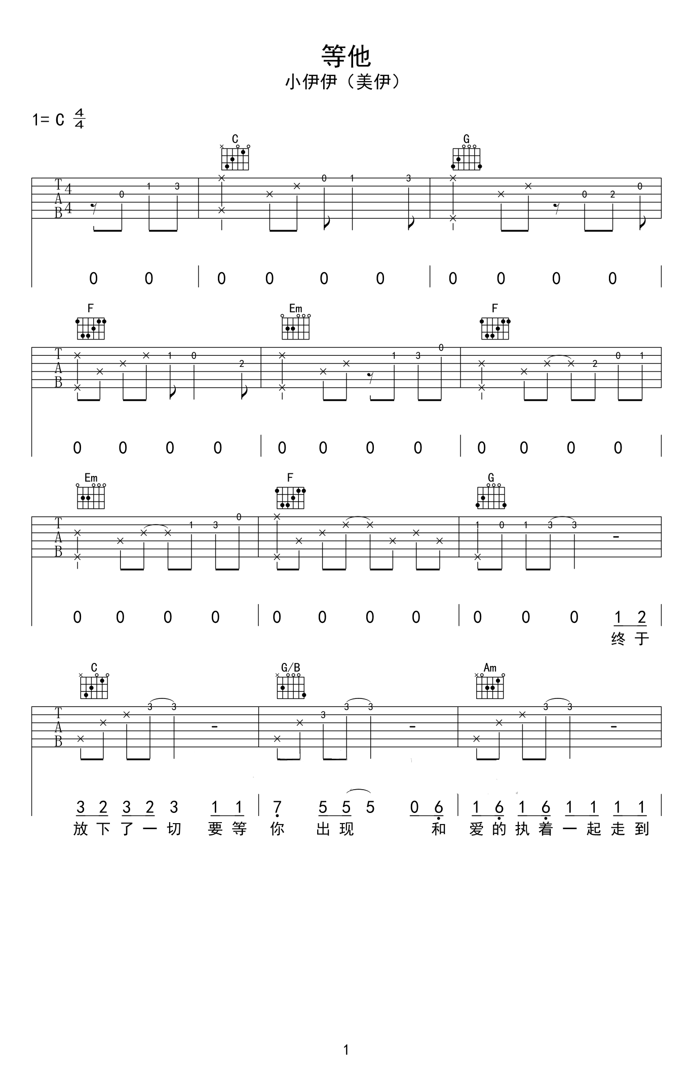 曲谱介绍: 等他吉他谱,C调弹唱谱,小伊伊演唱的一首动听的网络歌曲,等他六线谱,六张图片谱,网络琴友上传,琴谱网更新分享。温柔的歌词,悠扬的旋律,一句句唱进人的心里。