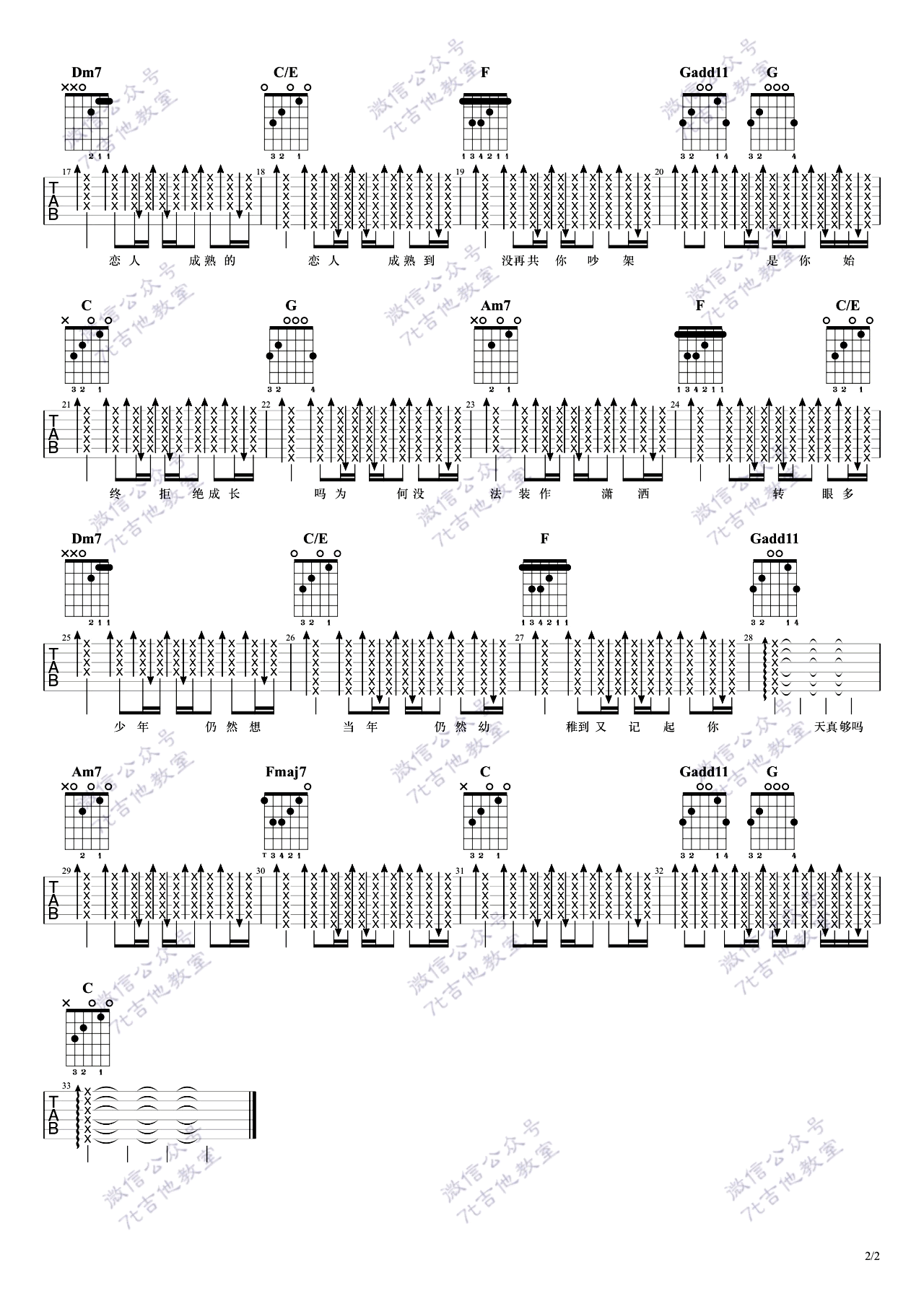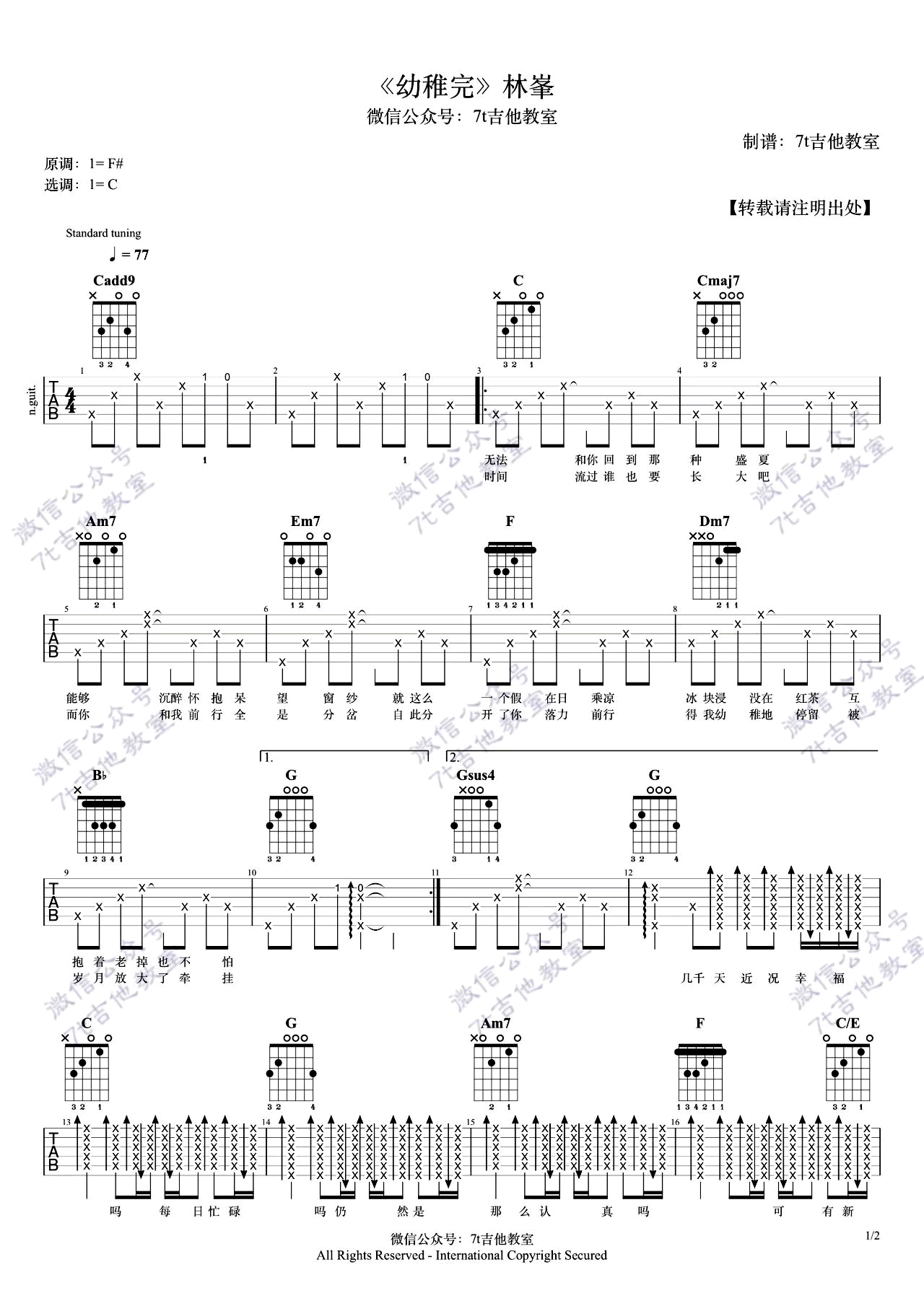 曲谱介绍: 幼稚完吉他谱,林峰演唱,一首好听的粤语歌曲,幼稚完六线谱,两张图片谱,感谢7t吉他教室编配,并为大家带来吉他弹唱演示视频,琴谱网上传分享。老师编配说明:这首歌的原调是F#大调,视频里我用了C大调的指法来编配,使用变调夹,夹在第6品弹出来就是原调哦!如果想要弹跟我同一个调只需要夹第1品……或者可以根据自己的音高夹在适合的位置哦~
