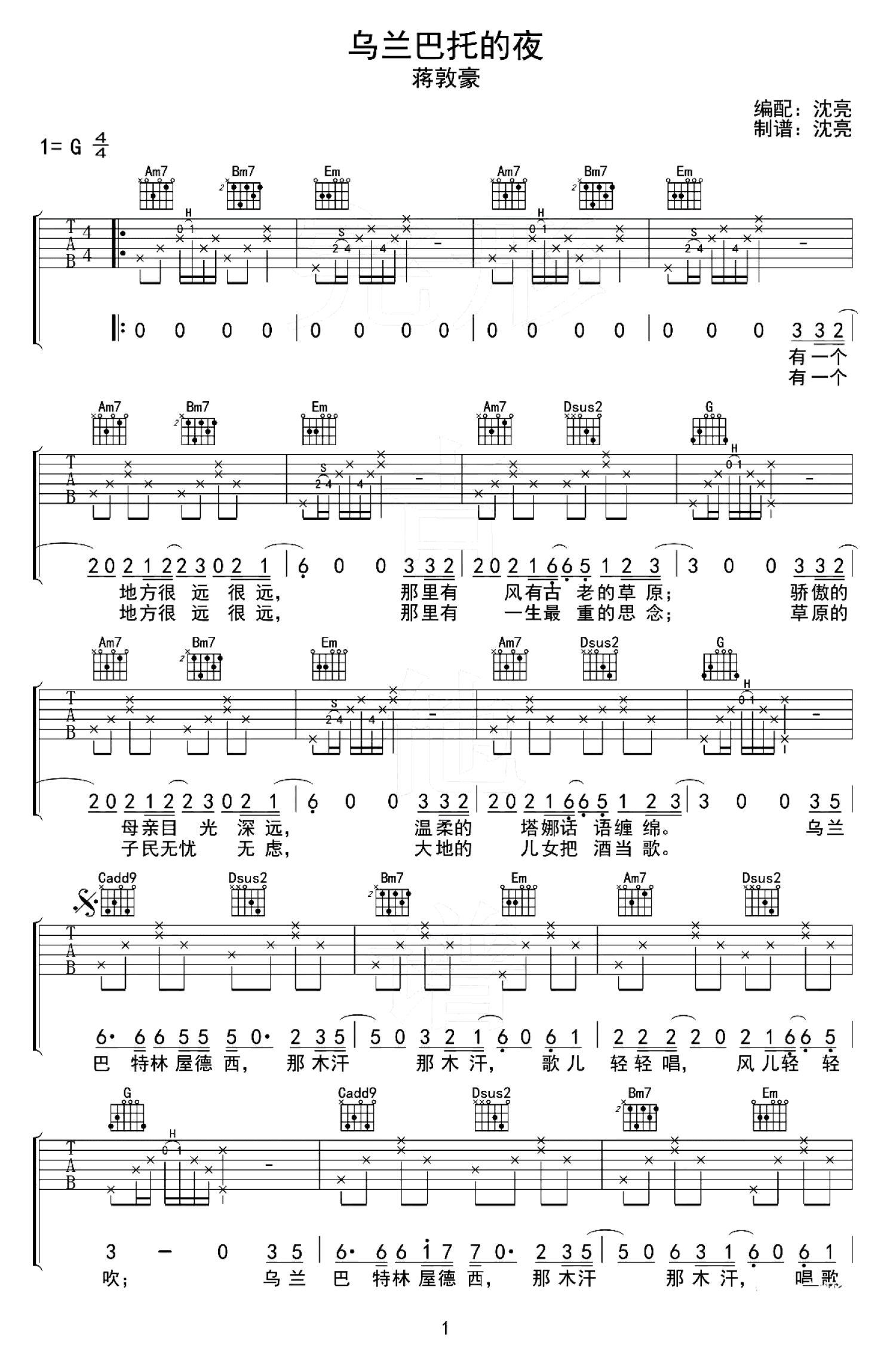乌兰巴托的夜吉他谱 - 蒋敦豪 - G调吉他弹唱谱
