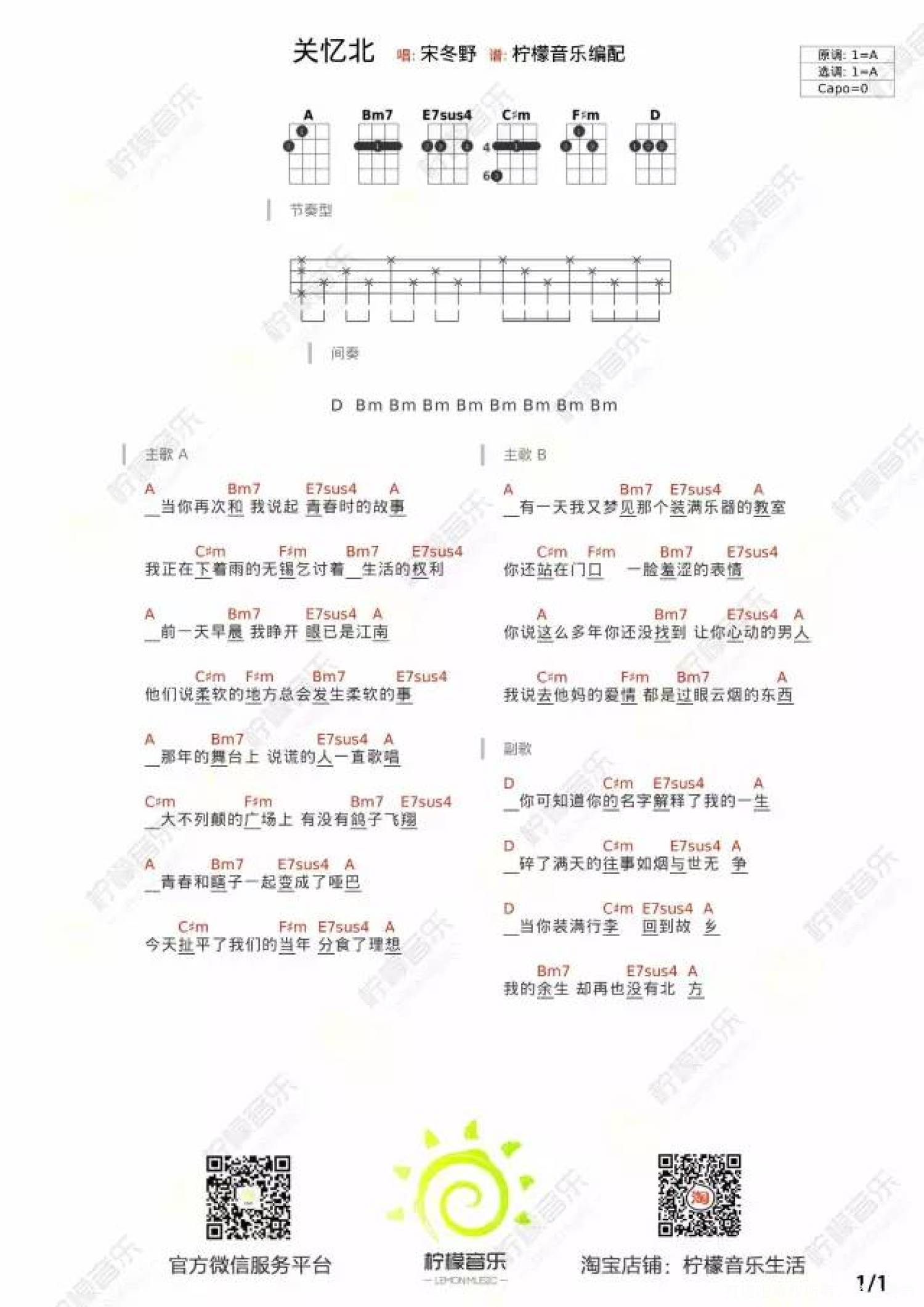 曲谱介绍: 宋冬野《关忆北》尤克里里谱,共有1张高清图谱,免翻页排版设计。