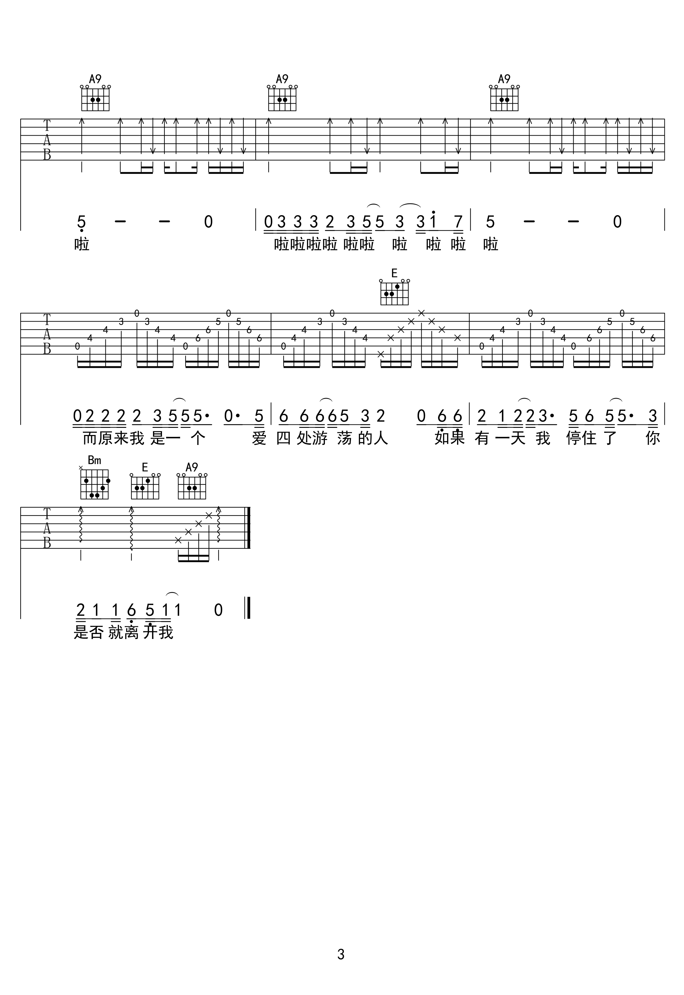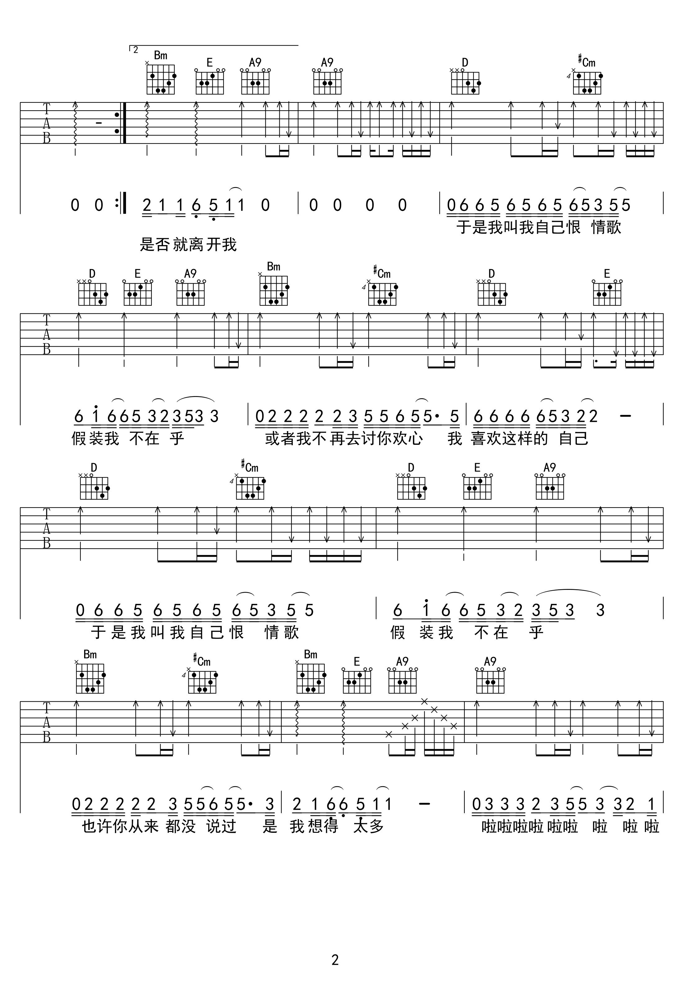 曲谱介绍: 恨情歌吉他谱,陈升演唱的一首经典老歌,恨情歌六线谱,三张图片谱高清版,老仙仙编配,琴谱网更新分享。 散淡的吉他隐约有点《不再让你孤单》的影子,但陈升开口后才发觉,他早已不是那个唱着把悲伤留给自己的流行歌星了。他完全放弃了从前的那种深情款款和一本正经,吊儿郎当侉里侉气地唱着。就像听过几遍《恨情歌》后你会发觉,整首歌的hookline应是“而原来我是一个,爱四处游荡的人”,并不是“于是我叫我自己恨情歌,假装我不在乎”。