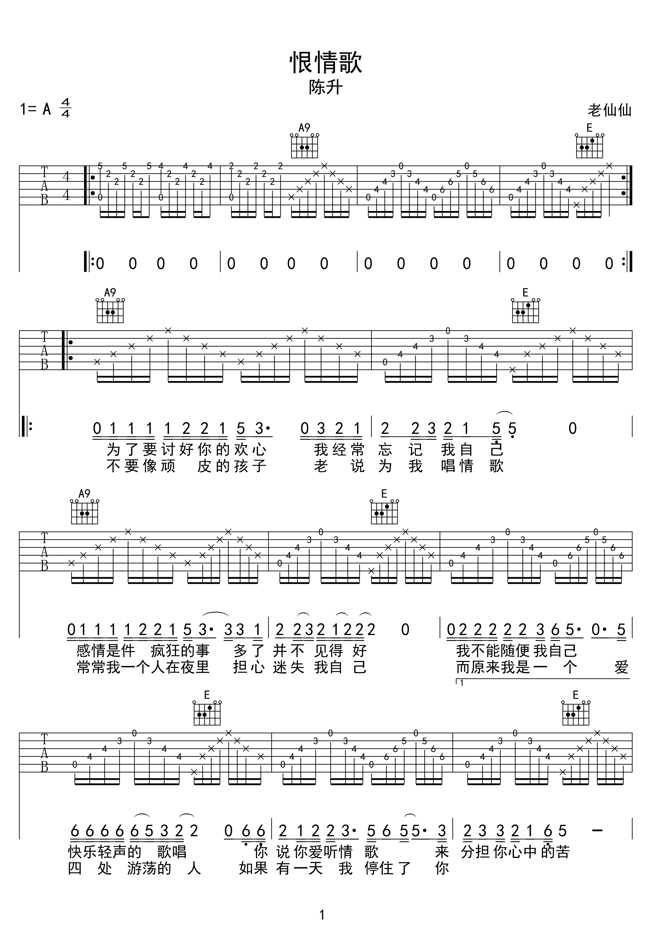 恨情歌吉他谱 - 陈升 - A调吉他弹唱谱