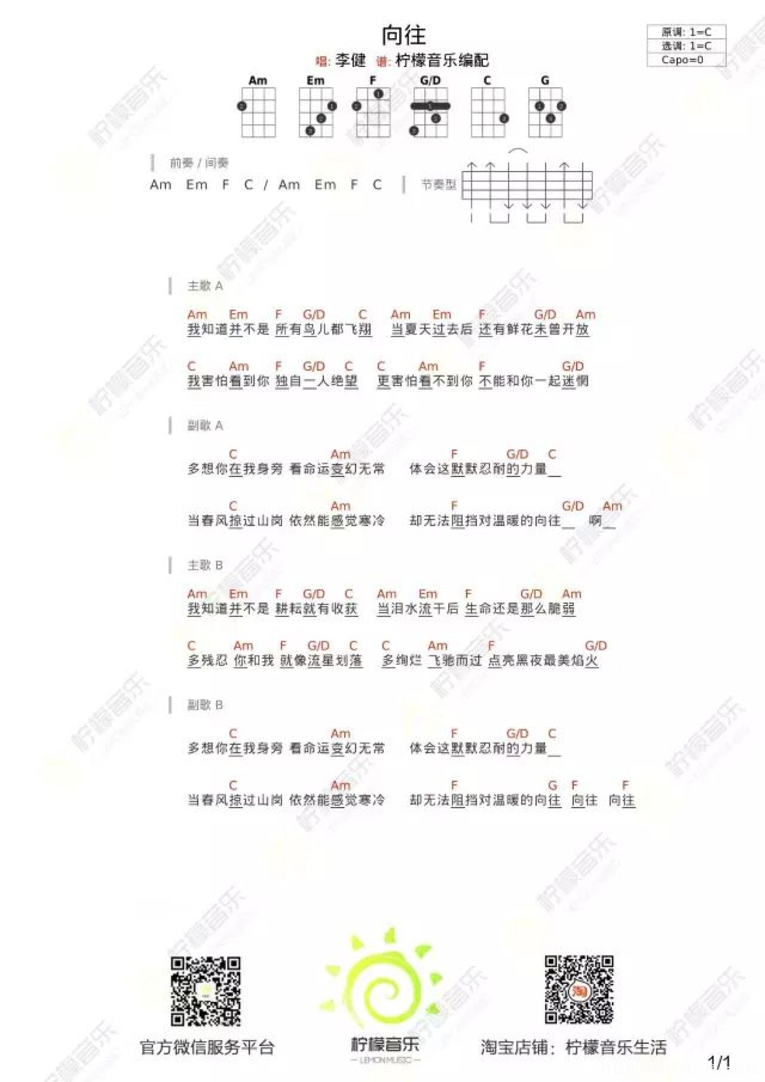 曲谱介绍: 李健《向往》尤克里里谱,共有1张高清图谱,免翻页排版设计。