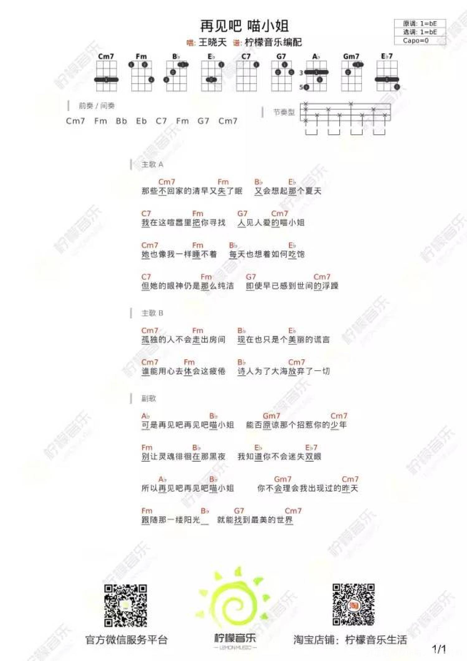 曲谱介绍: 王晓天《再见吧喵小姐》尤克里里谱,共有1张高清图谱,免翻页排版设计。