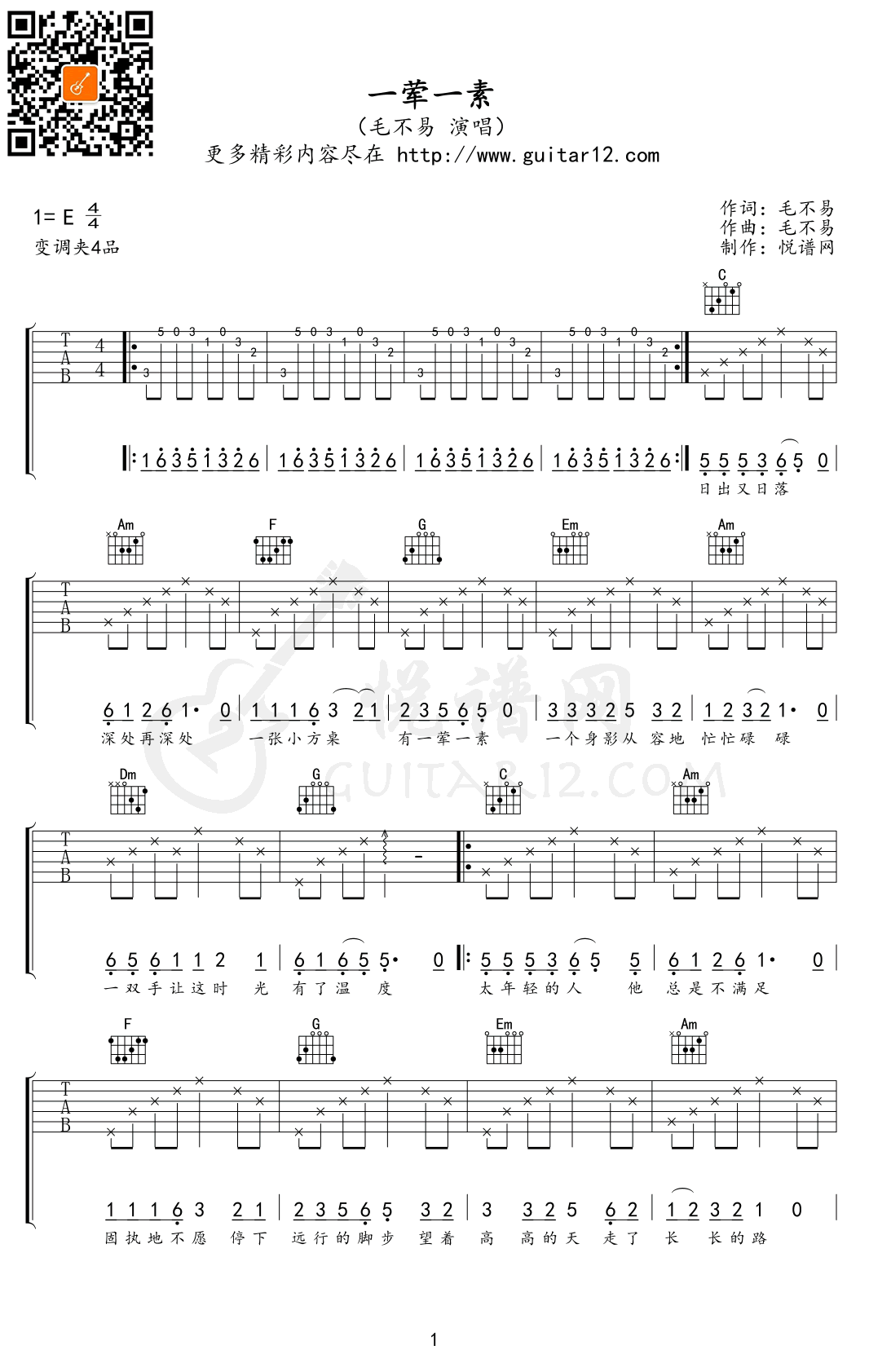 曲谱介绍: 毛不易《一荤一素》吉他谱,原调E,变调夹夹四品,选用C调指法编配,一荤一素六线谱,三张图片高清弹唱谱,感谢悦谱网制作琴谱网整理分享。 毛不琴谱网给母亲的歌,歌词有故事有温度,低沉的歌声无声无息地唱进人的灵魂,让人们驱赶孤独,抚平伤痛,然后继续前行。