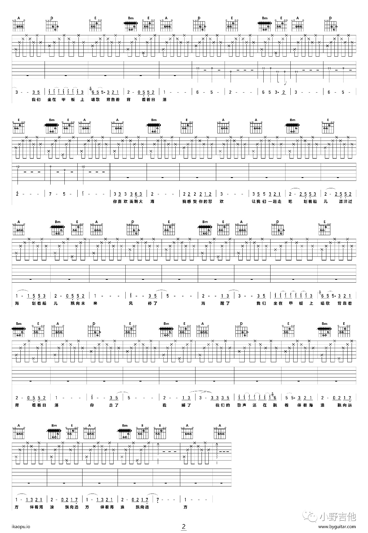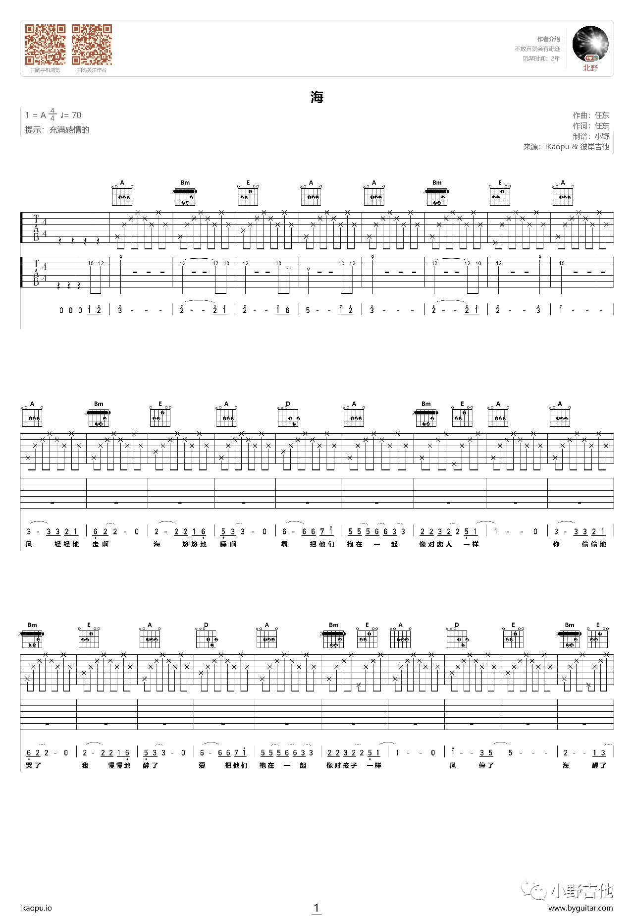 曲谱介绍: 《海》吉他谱,任东演唱的一首民谣歌曲,A调指法编配,小野吉他制谱分享,琴谱网上传推荐。