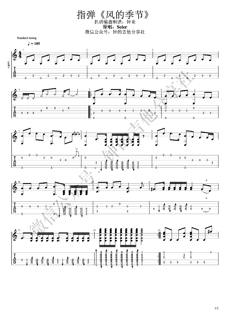 曲谱介绍: 风的季节指弹谱,一首经典的粤语歌曲改编,风的季节吉他独奏谱,钟的吉他编配分享,随谱附配套吉他指弹演奏视频,琴谱网上传更新。钟亚老师编配说明:这首歌本为徐小凤上世纪80年代唱的粤语歌,后被Soler组合重新编曲翻唱后大火,抒情的歌改成了摇滚的感觉别有一番风味。你们可以对比着听一下风格。我简单的把它改编成了指弹,G调的歌曲,以贝斯音开始,在每小节的第一拍和第三拍加了低音,在中间偶尔扫弦过度。本来我是想加上拍弦技巧的,但后来发现这首歌想突出的就是低音,加了拍弦反而没有了感觉。