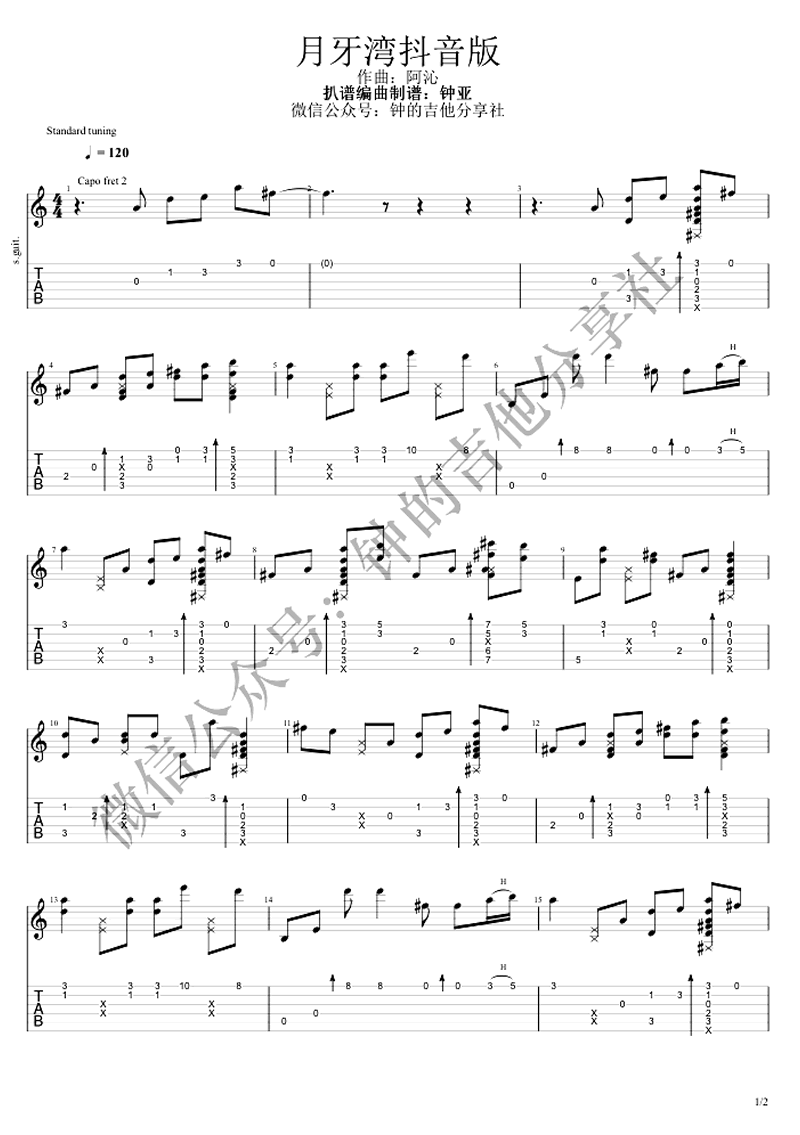 曲谱介绍: 月牙湾指弹谱,根据抖音版改编,一首网络短视频平台爆火的老歌翻唱,是谁的心啊,孤单地留下,他还好吗,我多想爱他。月牙湾吉他独奏谱,钟的吉他分享社扒谱编配,琴谱网更新。钟亚老师编配说明:这个曲子我编的很简单,也没有能力编复杂,把调性旋律扒出来后,在第二拍与第四拍加了拍弦,再加一点和声低音,简单的编曲就是这样子的谱子在下面,小伙伴们自己应该会学会的。