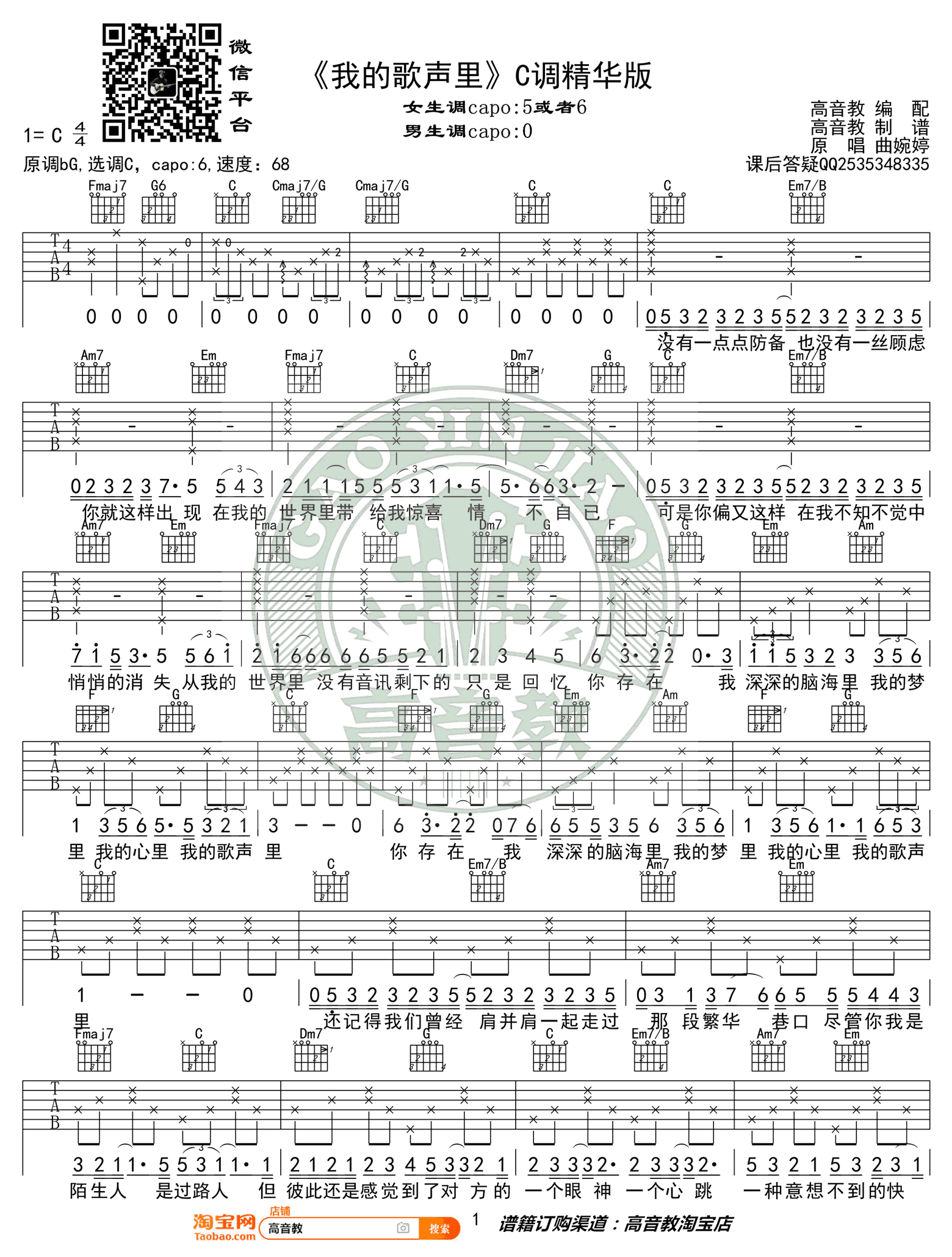 曲谱介绍: 《我的歌声里》吉他谱,曲婉婷的代表作品,歌曲原调bG,选调C,capo夹六品。我的歌声里六线谱,高清弹唱图片谱,高音教精华版编配,琴谱网整理分享。 一首抒情风格的歌曲,简单直白的歌词,每一句都在诠释着深深的爱,曾经甜蜜美好的情感,如今只能用回忆来缅怀,让所有经历的记忆产生共鸣。