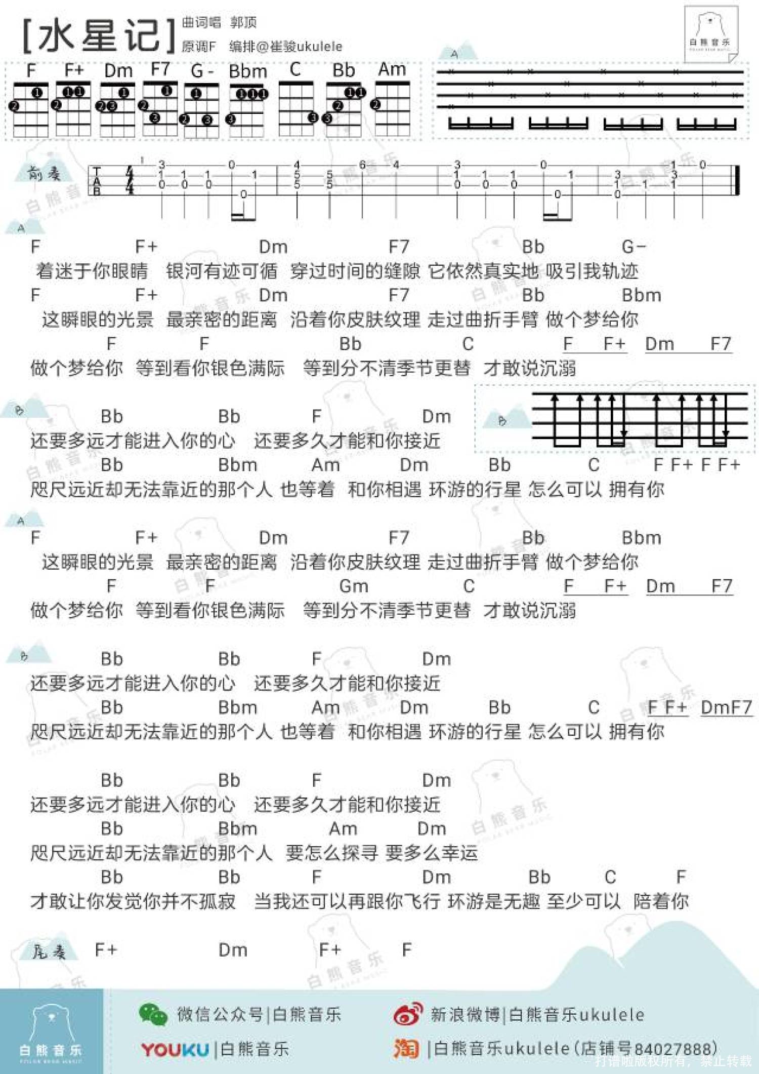 曲谱介绍: "水星是离太阳最近的一颗行星,但它无法脱离自己的轨道,也无法再接近太阳" 给大家介绍一位非常有才华的音乐人——郭顶,连薛之谦都极力推荐过的;前段时间薛之谦的新歌《动物世界》的作曲兼制作人就是郭顶;推荐他的这一首歌曲〈水星记〉,非常好听,歌词略悲伤冷清的情感,无言的陪伴却无法靠近,默默守护的温暖;专辑的封面设计也是超赞的!!! 〈水星记〉 是由郭顶作词、作曲并演唱的歌曲,作为第二波抒情主打曲收录于郭顶2016年11月25日发行的专辑「飞行器的执行周期」中。 MV 尤克里里教学 covered by 崔骏ukulele 谱子 ▼ 弹奏难度  (中等)