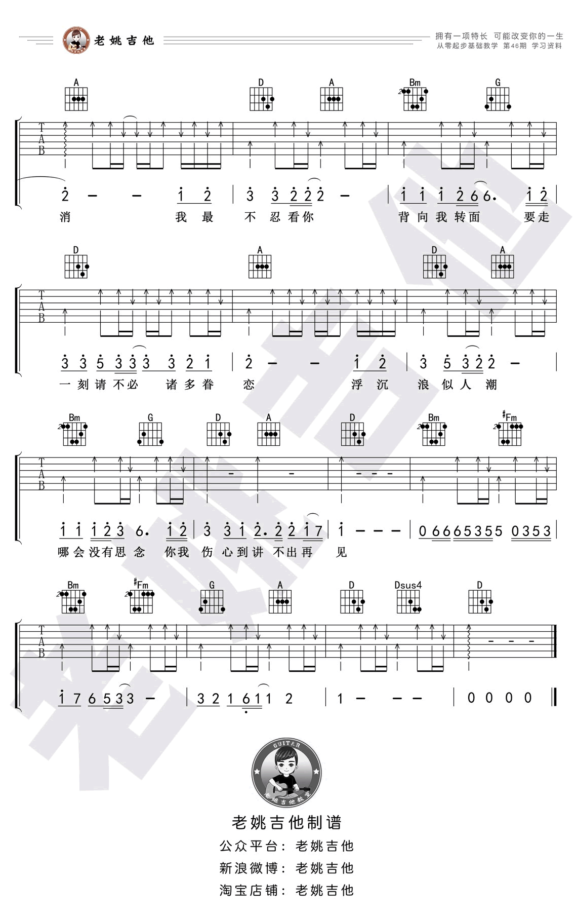 曲谱介绍: 《讲不出再见》吉他谱,谭咏麟演唱的一首经典粤语歌曲,讲不出再见六线谱,D调指法编配,高清图片谱三张谱例,老姚吉他编配,琴谱网上传分享。随谱附上配套吉他弹唱教学视频,本次吉他课程中配合歌曲讲解D大调基本乐理,喜欢这首老歌的琴友们跟随老师的讲解示范练习起来吧。 这首谭氏粤语情歌的代表作。除了向雪怀先生描写道别的歌词,更为这首歌在1994年纯金曲演唱会里谭校长的演绎而惊艳,那身水身汗的身影,台下那此起彼伏的欢呼声与尖叫声,现场的火花交织着灯光,令人印象深刻。
