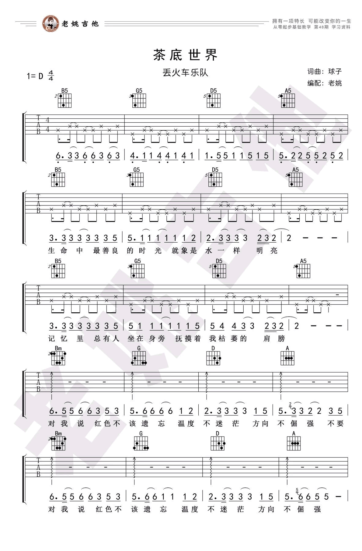 曲谱介绍: 《茶底世界》吉他谱,丢火车乐队的一首歌曲,茶底世界六线谱,D调弹唱六线谱,高清图片谱,感谢老姚吉他编配出品,本次基础教学配合歌曲和琴友们讲解D调练习和认识五和弦,琴谱网曲谱更新上传。随谱附上配套吉他弹唱教学视频,同学们跟随老师的示范解说练习起来。生命中最善良的时光,就像是水一样明亮。每次听丢火车的现场,《茶底世界》的前奏响起,曾经那些暗夜里起伏跌宕的心情,又重新被唤起。