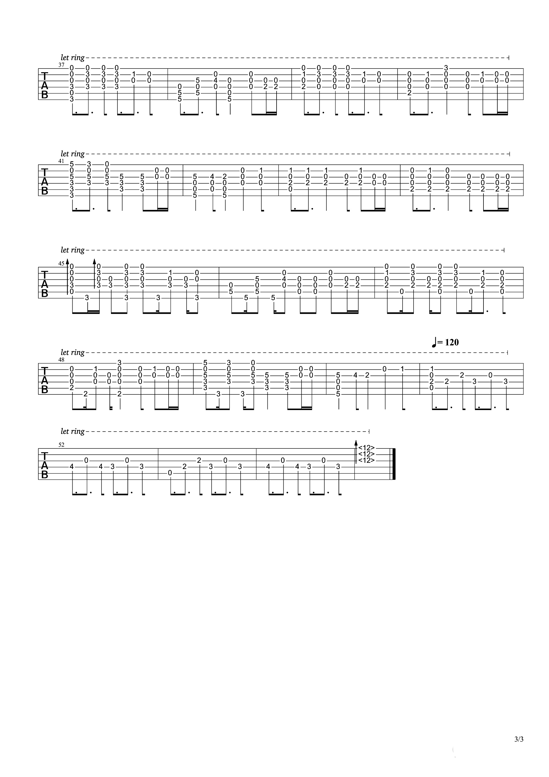 曲谱介绍: unravel指弹谱,这首曲子是studio Pierrot制作的电视动画《东京食尸鬼》的片头曲,特别是歌词内容贴合动画的主题,更是为动画增色不少。unravel吉他独奏谱,三张图片谱,感谢琴友上传分享,琴谱网更新。 动漫作品不但在剧情、角色等方面引人入胜,其中的歌曲也被很多人视为经典。很多朋友听过这首《东京喰种》主题曲之后都表示无法自拔。