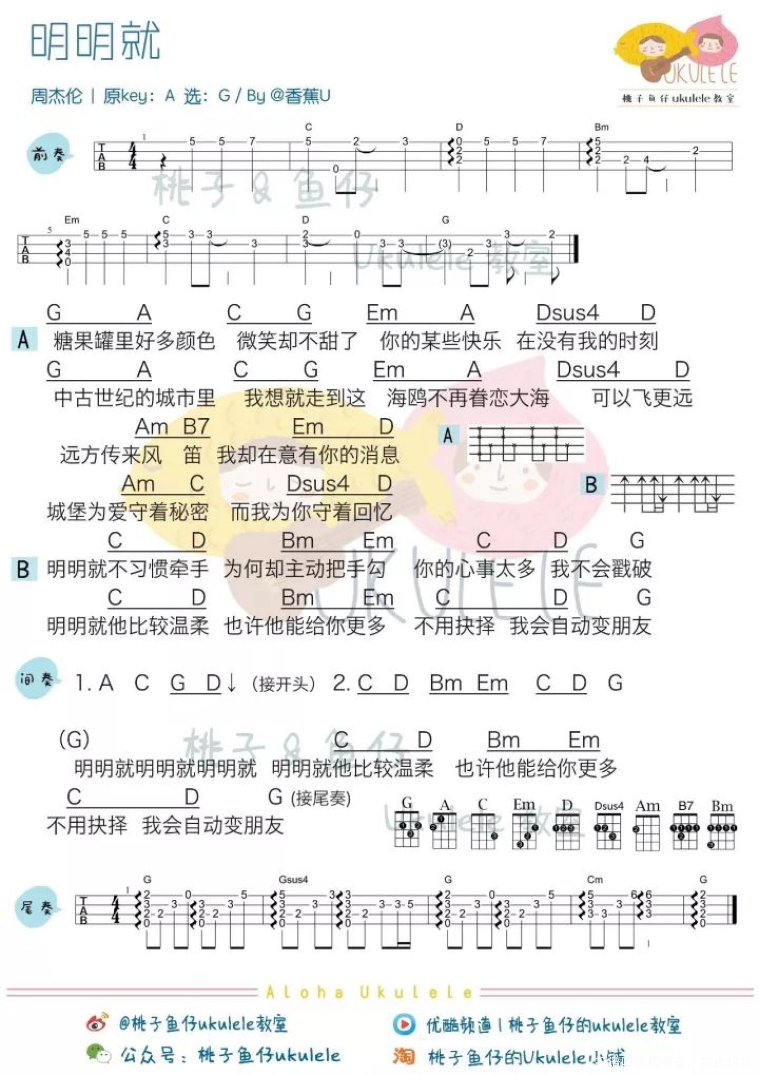 曲谱介绍: ● 这首歌名独特的「明明就」,以口头禅式的语法,表现出对爱情的固执与倔将;歌词描述一对恋人因故分离两地,一个在充满中古世纪古堡的苏格兰,一个在地球的另一端;「你的某些快乐,在没有我的时刻」,无法时时刻刻陪伴身边,分享彼此的欢笑悲喜,「城堡为爱守着秘密,而我为你守着回忆」,当爱情只剩下回忆却没有现在进行式,也许在你身边已经出现一位比我还温柔的他,也许他能给你更多,内心的挣扎交战已无法用回忆取暖,过往的甜蜜回忆无法与距离和时间抗争,只能举双手投降,这段恋情终究从恋人关系自动变朋友。  “城堡为爱守着秘密 而我为你守着回忆“ 爱泪交织的远距离恋爱片   尤克里里弹唱教学 明明就 尤克里里谱