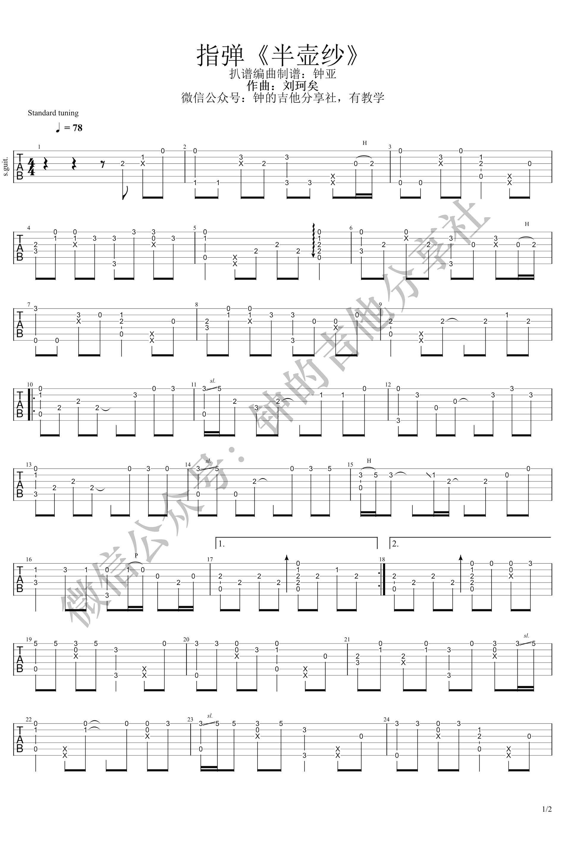 曲谱介绍: 半壶纱指弹吉他谱,刘珂矣的一首的古风歌曲改编,电视剧《小女花不弃》的插曲,旋律柔情动听。半壶纱吉他独奏谱,钟的吉他社编配分享,琴谱网整理上传。随谱附上配套吉他演奏视频,同学们参照钟亚老师的指弹示范学习。编配说明,歌曲原调C调,谱子上是不加变调夹的,演奏视频里采用了变调夹加三品升D调。