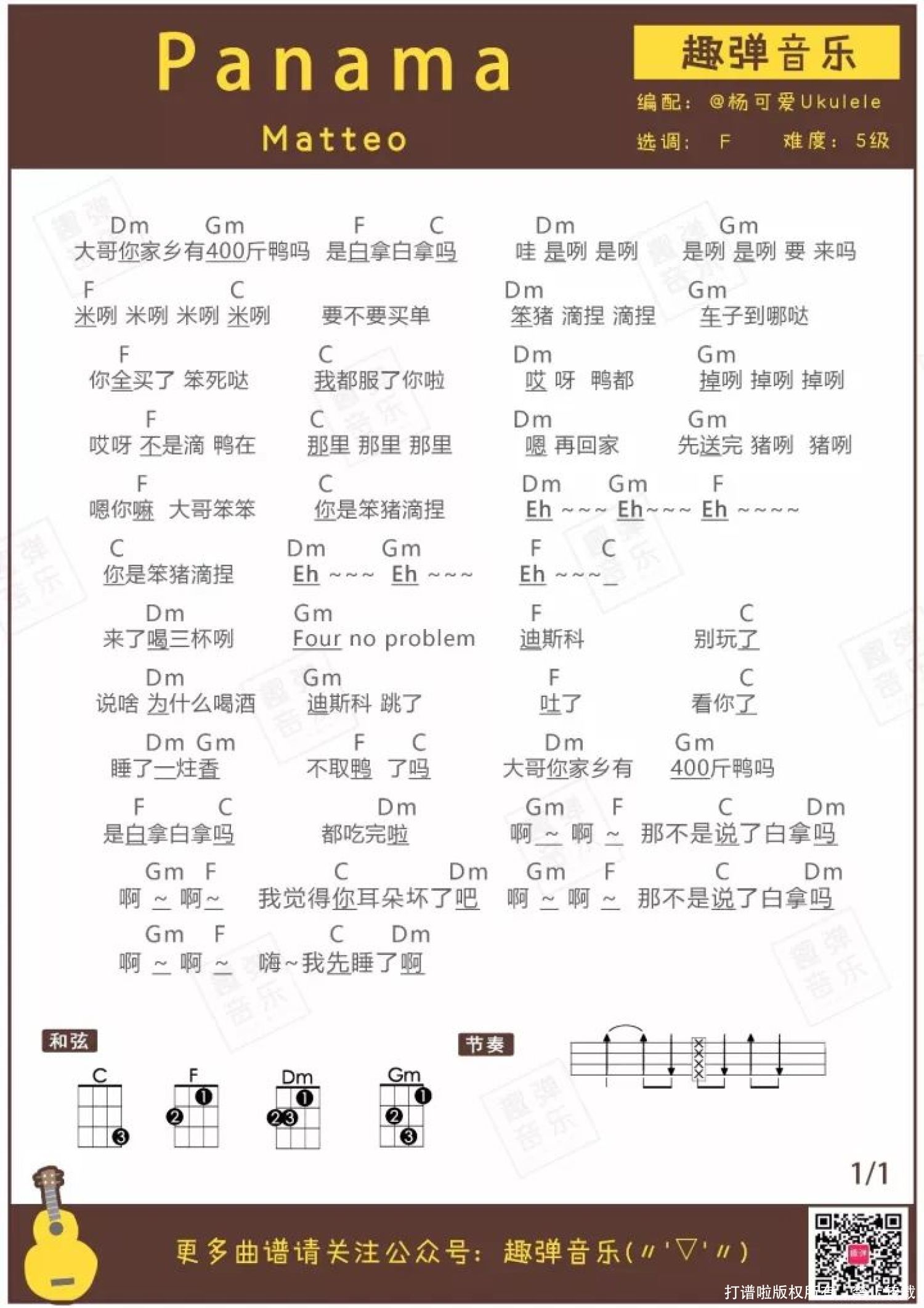 曲谱介绍: 最近,一首洗脑神曲火遍网络,据说听了它的人都笑到抽搐。 但是我们的杨可爱表示,网上的东西都是骗人的!这首歌让她根本笑不出来…… 鬼知道她经历了什么?或许看了视频,你就会明白,并对她的遭遇深表同情…… 有请杨可爱 与我们的峰峰 带来《PANAMA》 趣弹MV 原来网上流传的“大哥家有400斤鸭可以白拿”的传说都是骗人的! 啊多么痛的领悟,杨可爱哭晕在厕所! 这首歌告诉我们,天上不会掉馅饼,天下没有白拿的鸭,不要跟陌生人回家…… 关于歌曲 ● 由罗马尼亚歌手Matteo演唱的歌曲,收录于专辑《Panama》中。 ● 因在视频软件上被广泛用作舞蹈背景音乐,这首2013年发行的歌在中国网络上走红。 这位有点帅的大叔就是《panama》的原唱matteo。原曲歌词大意,实际上是表达对自己喜欢的妹子的爱意,想要与她飞往巴拿马。 因为歌曲开头第一句歌词的谐音太像“大哥你家乡有400斤鸭卖是白拿白拿吗?”而被网友疯狂改编、玩坏。 也许原唱matteo都不会想到他的这首歌在中国那么火。小编表示一旦点开播放,点头抖腿的节奏根本停不下来!~   歌曲曲谱