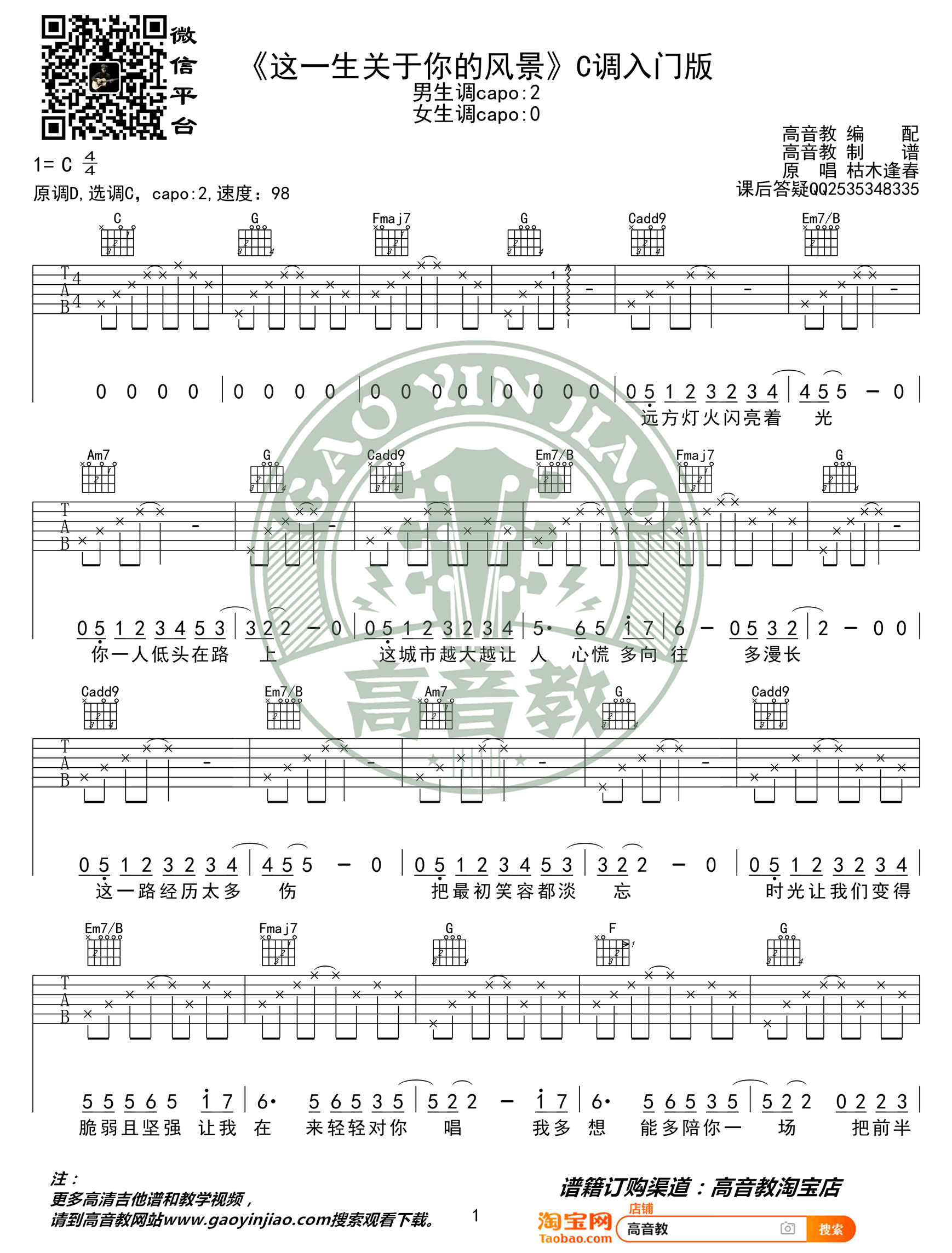 曲谱介绍: 《这一生关于你的风景》吉他谱,枯木逢春演唱,原调D,选用C调,入门版编配,男生调Capo夹二品。这一生关于你的风景六线谱,高清弹唱图片谱,琴谱网上传分享。