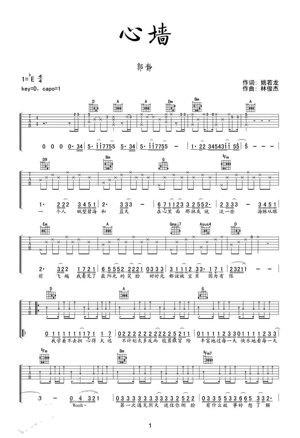 心墙吉他谱 - 郭静 - D调吉他弹唱谱