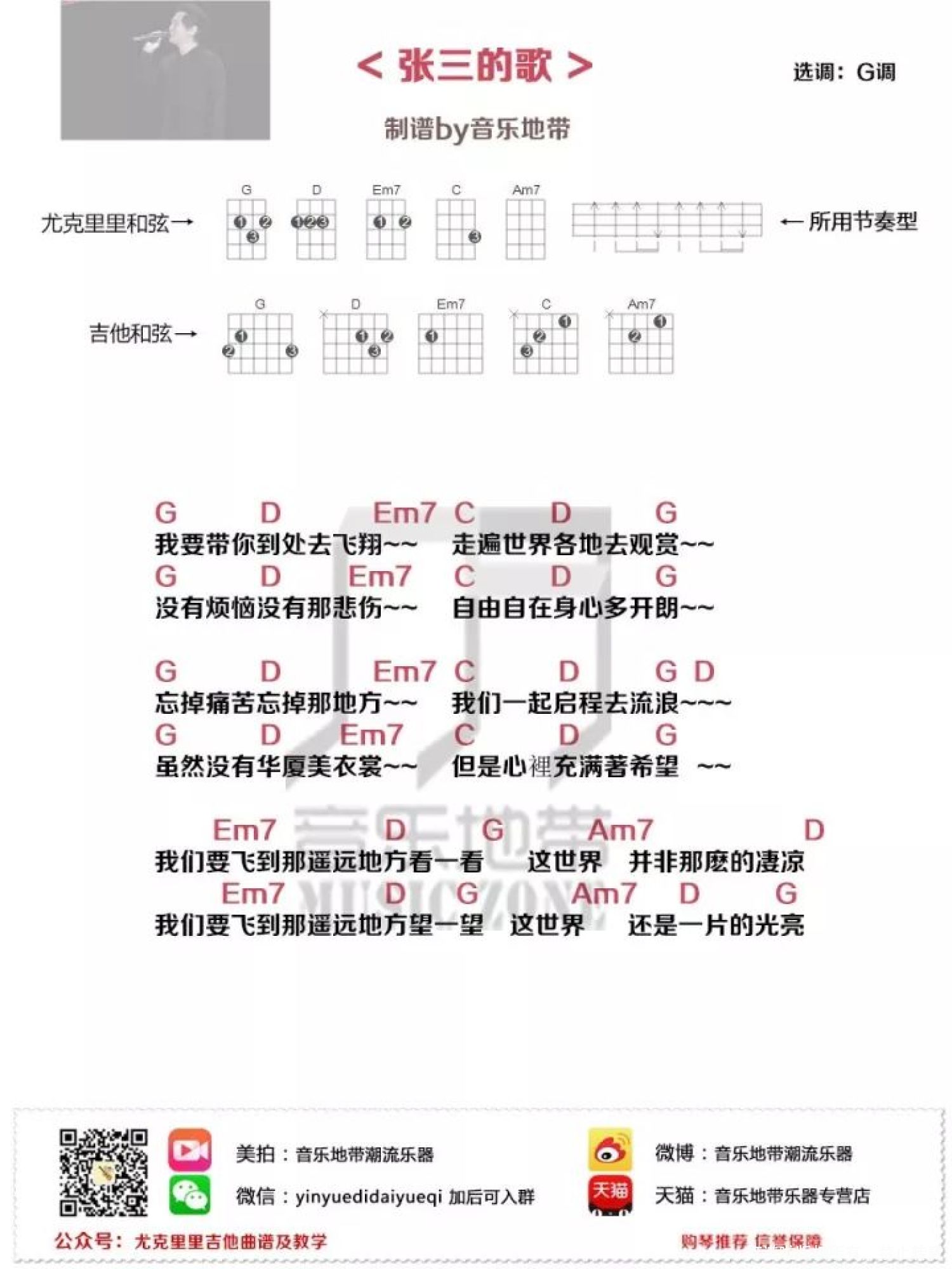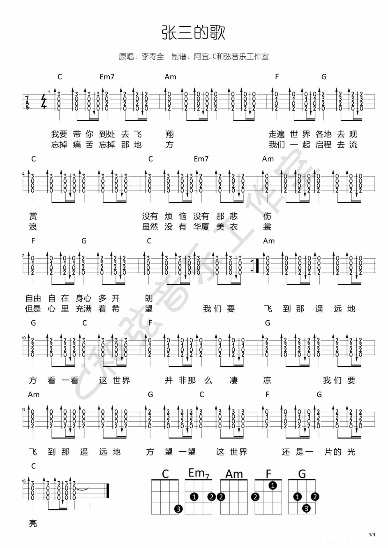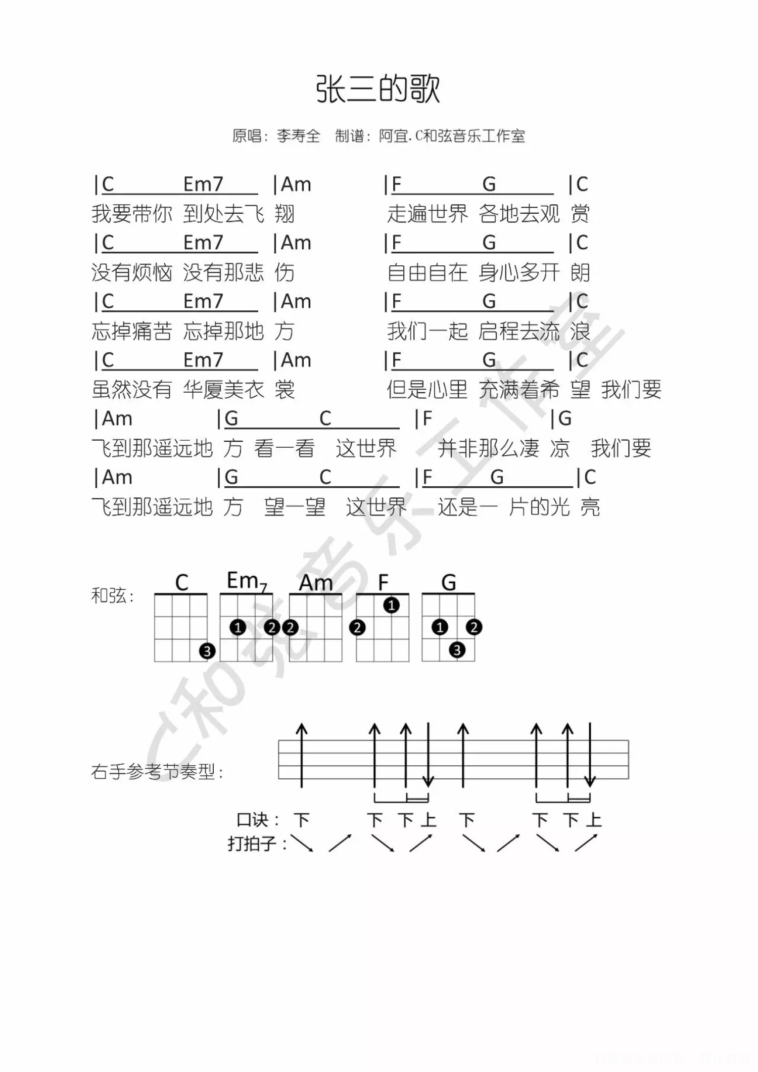 曲谱介绍: 很经典的一首民谣,张三的歌,温馨又洗脑。原唱李寿全。 被齐秦、蔡琴、张悬等等各种明星翻唱过·······   Ukulele Cover 视频教学 张三的歌尤克里里谱 C调谱 G调谱