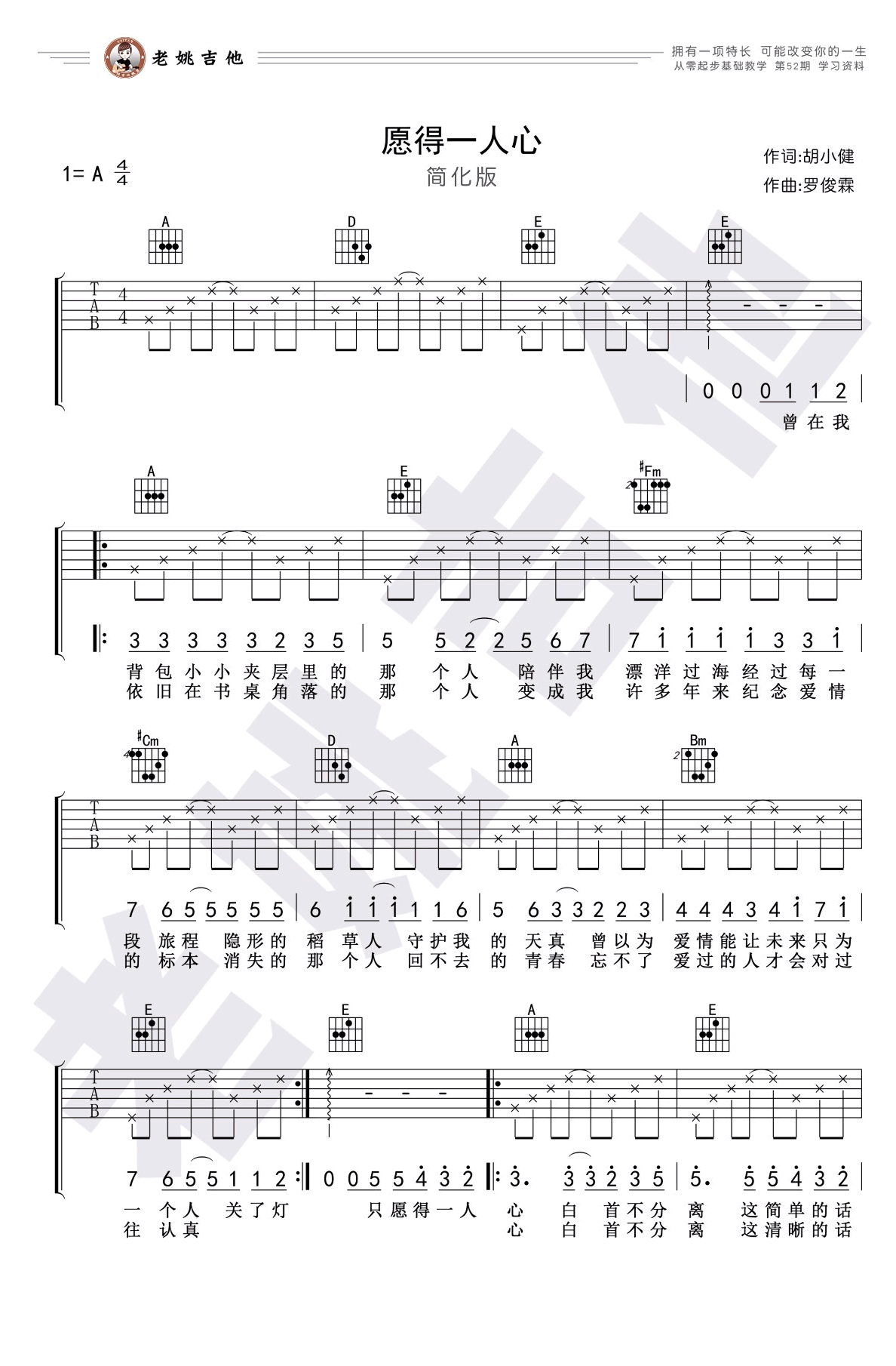 曲谱介绍: 《愿得一人心》吉他谱,李行亮演唱,电视剧《最美的时光》暖心片头曲,愿得一人心六线谱,A调弹唱谱简化版,感谢老姚吉他编配,琴谱网整理分享。随谱附上《愿得一人心》吉他弹唱教学视频,同学们可以参照配套曲谱跟随老师的示范讲解进行练习,本次吉他基础教学将配合歌曲介绍A调入门基本乐理。