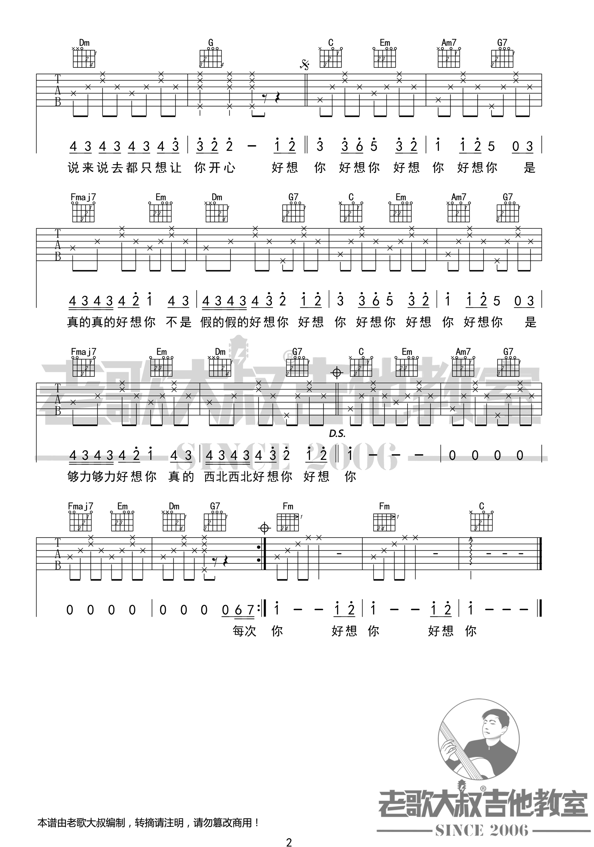 曲谱介绍: 《好想你》吉他谱,朱主爱演唱的一首甜蜜情歌,C调指法弹唱谱,变调夹夹五品。马来西亚音乐人黄志明词曲创作,好想你六线谱,老歌吉他编配,琴谱网分享上传。 一首旋律和歌词极具魔性的歌曲,轻快而又热烈的表达了恋爱时的幸福情绪, 感觉一年下来吃的糖都抵不过这首歌,相信你也被它强制洗脑了~~~歌曲简单又好听,拿上吉他开始弹唱起来吧!