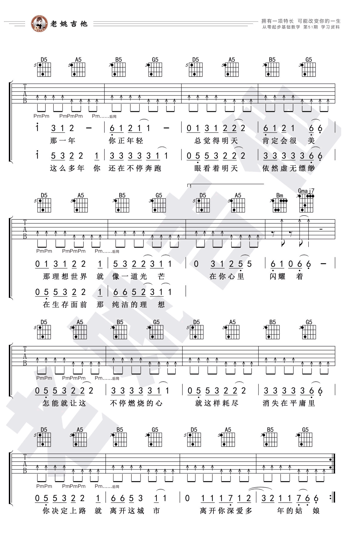 曲谱介绍: 那一年吉他谱,许巍的一首经典代表歌曲,D调指法编配弹唱。那一年六线谱,完整版共四张弹唱图片谱。老姚吉他出品,琴谱网更新分享。随谱配套附上《那一年》吉他教学视频,本次吉他基础课程配合歌曲,为同学们讲解D调练习和闷音练习。