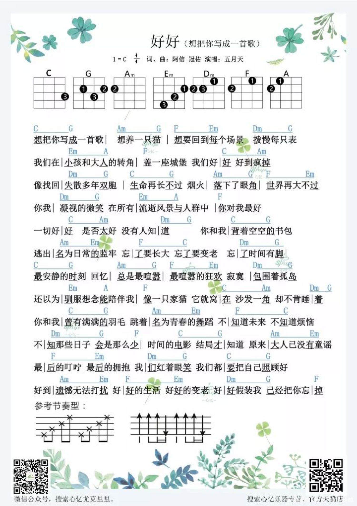 曲谱介绍: 【 好好(想把你写成一首歌) 】 《好好》(好想把你写成一首歌)是由五月天乐团演唱的日本导演新海诚新作《你的名字》的中文版主题曲。这首歌曲由冠佑及阿信作曲,阿信作词,五月天倾情献唱,林志玲、徐若瑄特别出演mv。曲风十分得温柔,让人发自内心被感动。 很多人喜欢五月天,就是喜欢他们歌里的热血与青春。《好好》可谓把站在青春尾巴的我们描述得淋漓尽致。 安静的曲调,温柔的嗓音,让我们随着歌思绪飘荡。你一定也有玩的很好的人,恋人也好朋友也好,总会因为一些事情闹得两个人不好,但是呀我们仍要相信彼此,“因为我们是同伴呀!('◡')”   好好 尤克里里谱