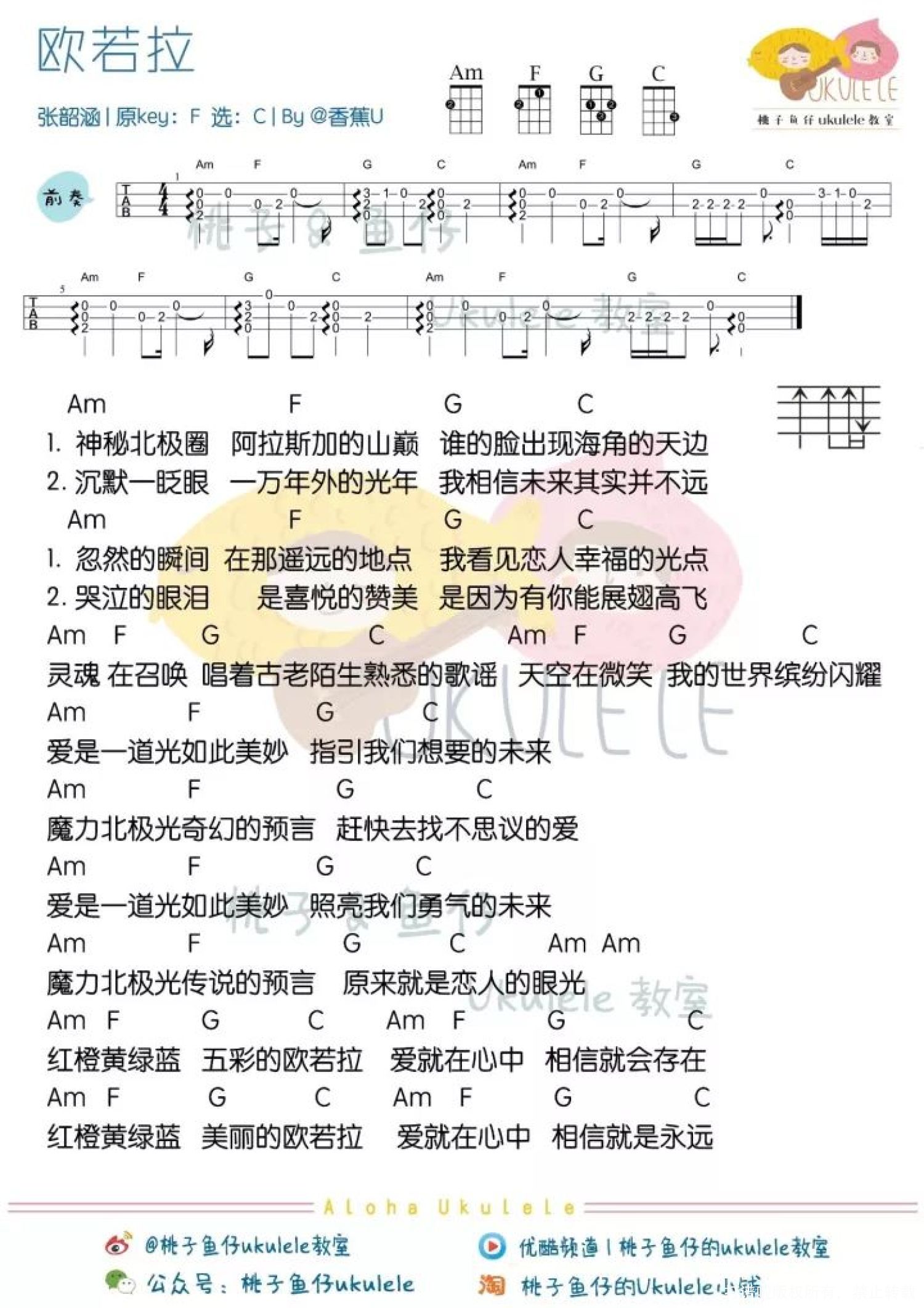 曲谱介绍: 关于张韶涵的记忆,还停留在大街小巷传唱的《遗失的美好》《欧若拉》《隐形的翅膀》中的 “巨肺小天后”,以及《海豚湾恋人》《公主小妹》里单纯可爱的台剧女王。 在那个网络不发达的年代,她是每个人 MP3 里粉红色的少女心。 安顿好了家人和自己的生活,这两年,她才终于渐渐回归到了大众的视野。 青春记忆里,那个扑闪着大大眼睛的音乐精灵,挥舞着隐形翅膀的勇敢坚强的女孩儿,终于又回来了。 她依旧是那个拥有巨大能量的音乐天后。 这首歌张韶涵唱出属于World Music世界音乐的温暖语言,仿佛如北极光黎明女神欧若拉Aurora在吟唱大地之歌。深具异国风情的编曲,加上作词家施立别出心裁的歌词,呈现出张韶涵直接的声音穿透力,让听者仿佛感受到声音的光芒。   欧若拉 尤克里里谱