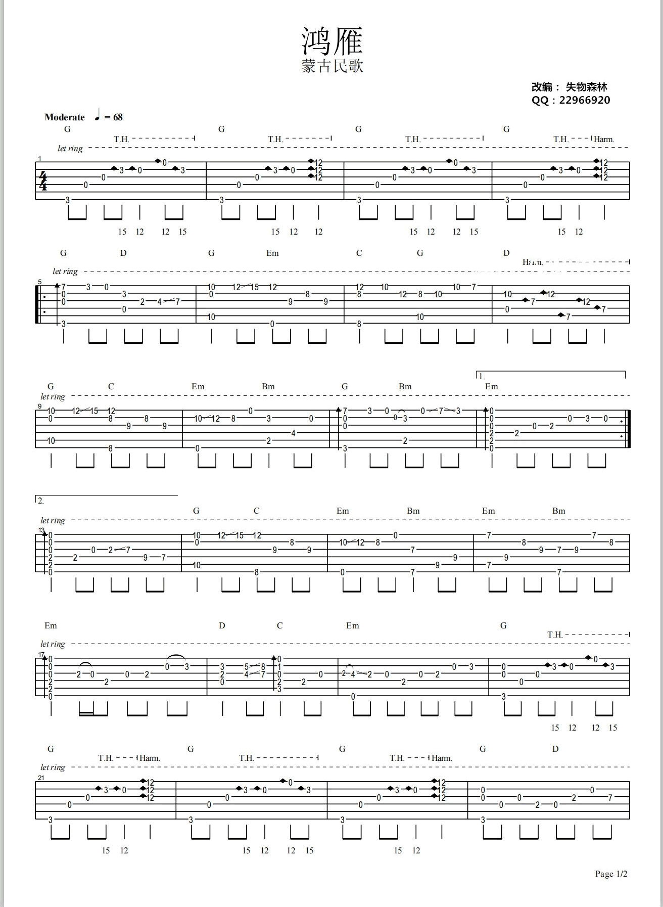 曲谱介绍: 鸿雁吉他谱指弹版,一首经典流传的蒙古歌曲改编,鸿雁吉他独奏谱,高清图片谱。感谢失物森林编配,并带来配套吉他演奏视频。 失物森林老师演奏说明:我没去过呼伦贝尔大草原,对呼伦贝尔大草原的影像全是影视作品的画面。我非常向往内蒙古大草原,想象着这里的茵茵碧草,悠悠白云,湛蓝如洗的天空,还有奔驰的骏马和成群的牛羊……歌曲《鸿雁》为我打开了这个画面,缓缓的旋律让我心驰向往,让我对呼伦贝尔大草原充满向往……在改编时就用泛音与实音结合,营造一个广阔的画面,整曲旋律舒缓;技巧上主要运用滑音技巧。