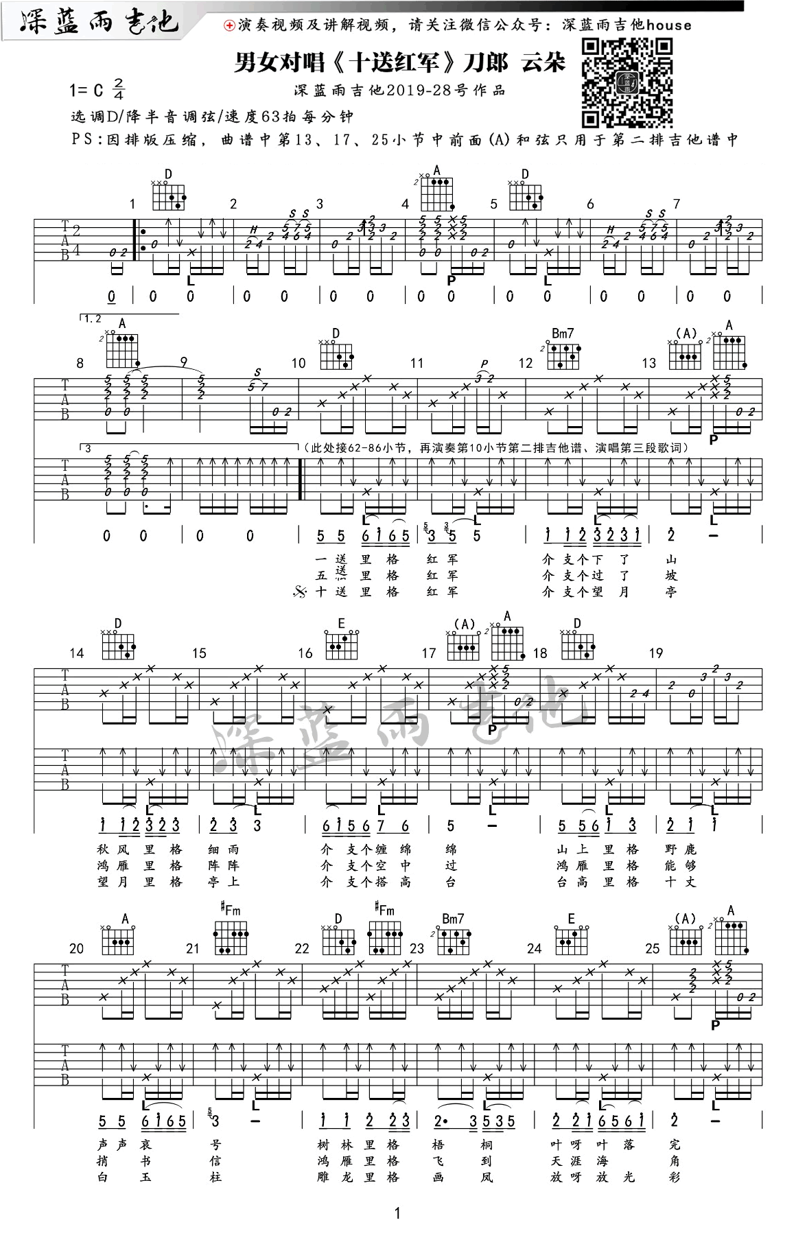 曲谱介绍: 十送红军吉他谱,刀郎云朵演唱的一首男女对唱经典红歌,十送红军六线谱,原调C,选用D调,降半音调弦,三张高清图片谱。