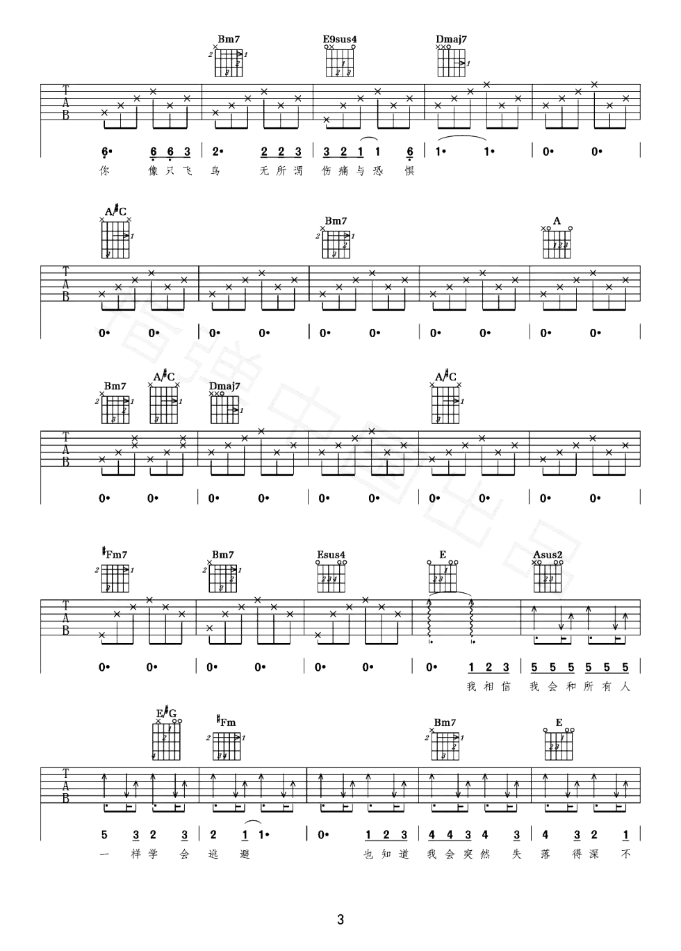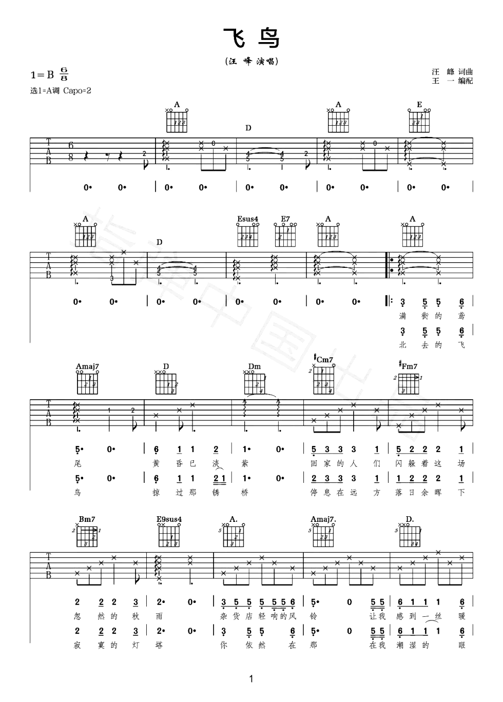 曲谱介绍: 飞鸟吉他谱,在这个浮躁的年代,汪峰的歌总会给我们坚持和热爱的力量,就像从小鸟到飞鸟,依然自由勇敢,只是多了一份顿悟与坦然。《飞鸟》吉他弹唱谱,这首歌原调为B调,一般B调的歌曲都会使用变调夹,选择G调或者A调指法,或者将吉他调弦降半音,使用C调指法。这里老师使用A调指法来编配,Capo夹二品,编配的时候可以使用到一些高级的和弦指型。完整版共四张图片六线谱。