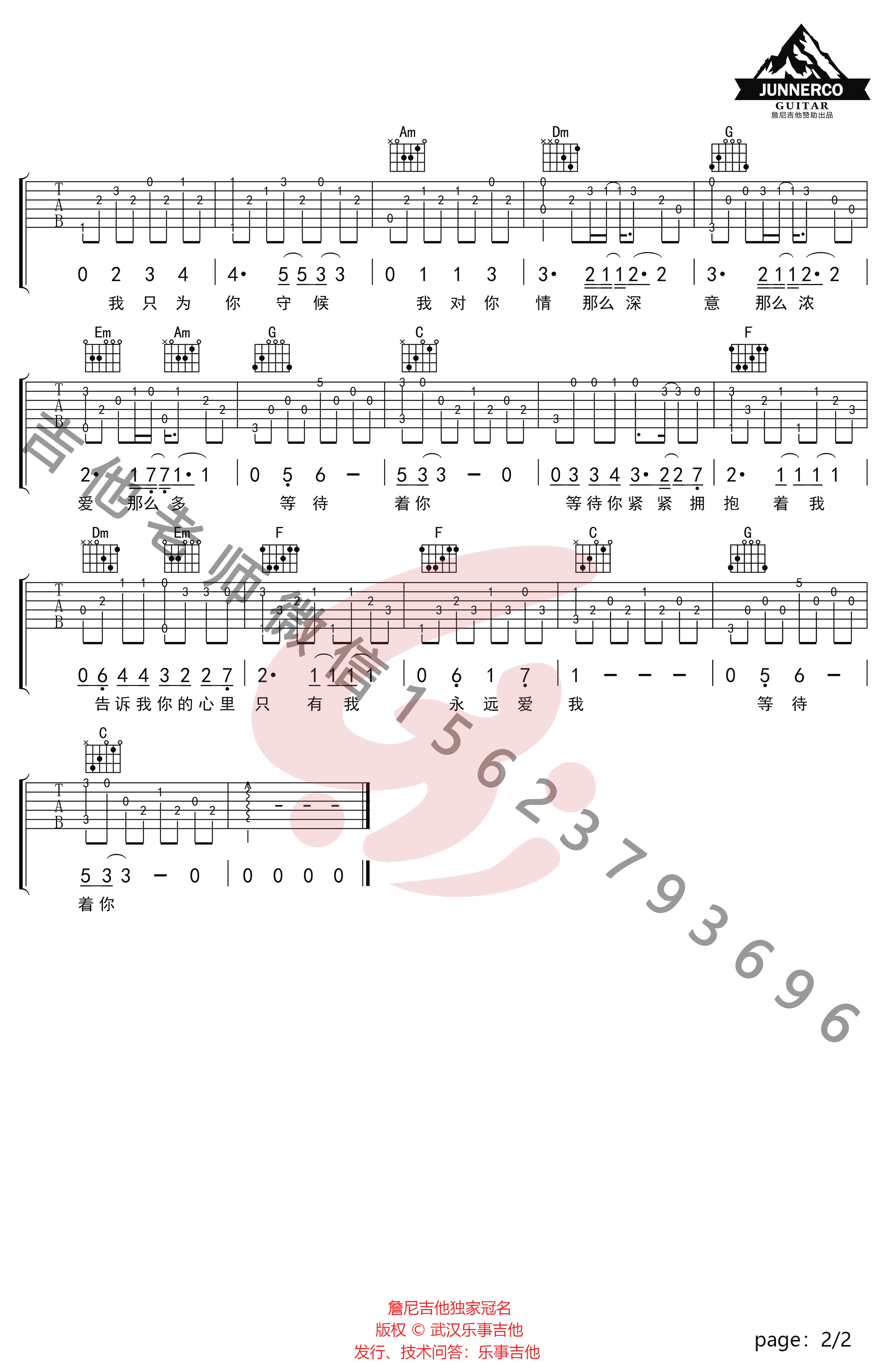 曲谱介绍: 《一生守候》吉他指弹谱,王若琳演唱的一首情歌改编,电影《大上海》主题曲,一生守候吉他独奏谱,新手简单版本,两张高清图片谱,乐事吉他编配,并为琴友们送上曲谱配套指弹教学视频,琴谱网上传更新。