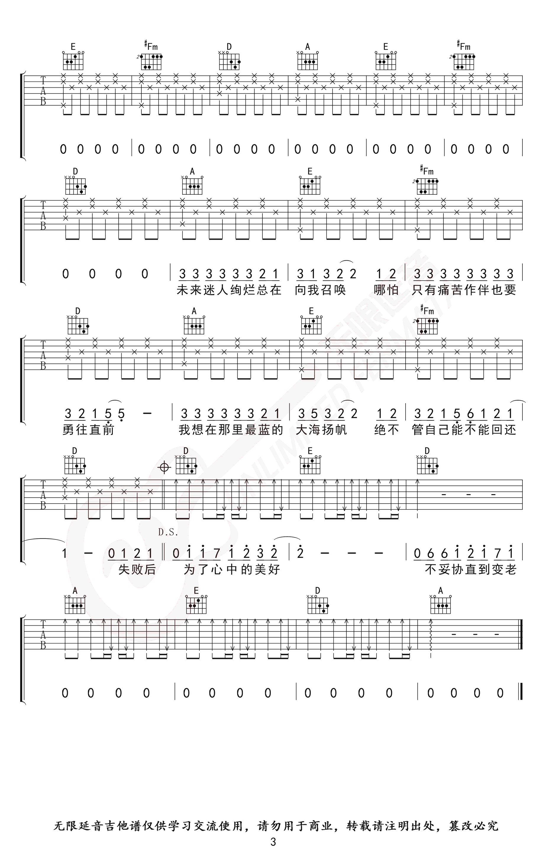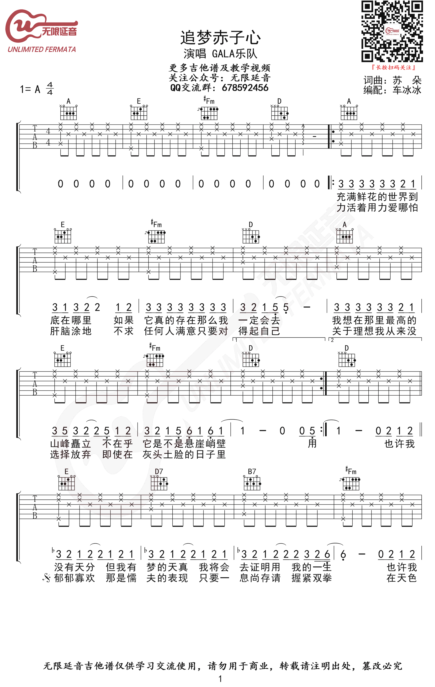 曲谱介绍: 《追梦赤子心》吉他谱,GALA乐队的一首经典励志歌曲,追梦赤子心六线谱,A调指法,高清弹唱六线谱,三张图片谱。无限延音编配分享,琴谱网整理上传。 歌声中每个音符,都和我们内心产生共鸣,生命的呐喊,命运的抗争,对自己理想的追寻,以一个赤子之心,傻傻的坚持,也许这是我们每一个理想主义者的心声。