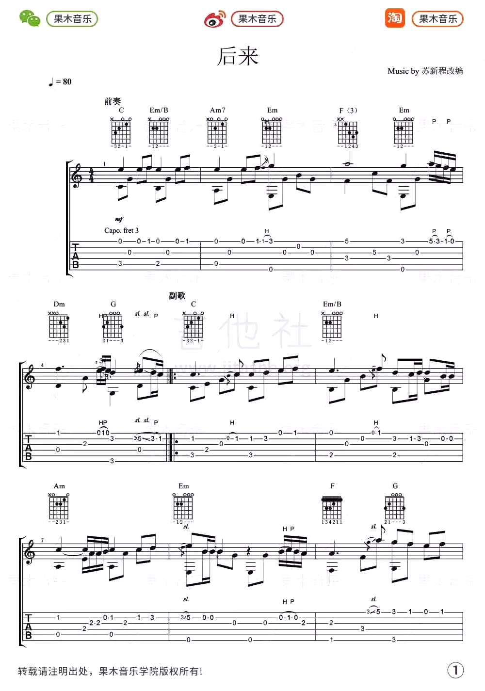 曲谱介绍: 《后来》指弹谱,刘若英经典歌曲改编,后来吉他独奏谱,带前奏尾奏完整版共八张图片谱,苏新程老师编配,果木音乐出品,附《后来》指弹吉他演奏视频,琴友们参照演示练习。琴谱网整理分享。