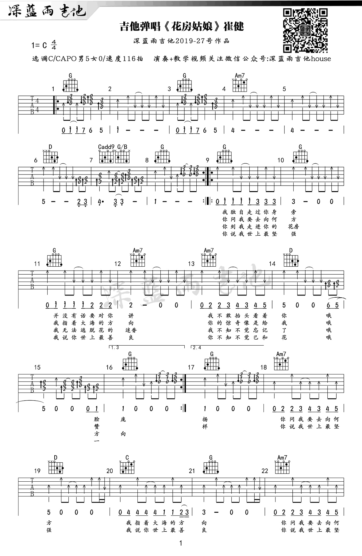 曲谱介绍: 《花房姑娘》吉他谱,崔健的一首经典代表歌曲,花房姑娘六线谱,选用C调指法,变调夹建议男生调夹五品,深蓝雨吉他编配出品,琴谱网分享上传。随谱附上《花房姑娘》吉他弹唱和教学视频,琴友们跟随老师讲解示范,多多练习。