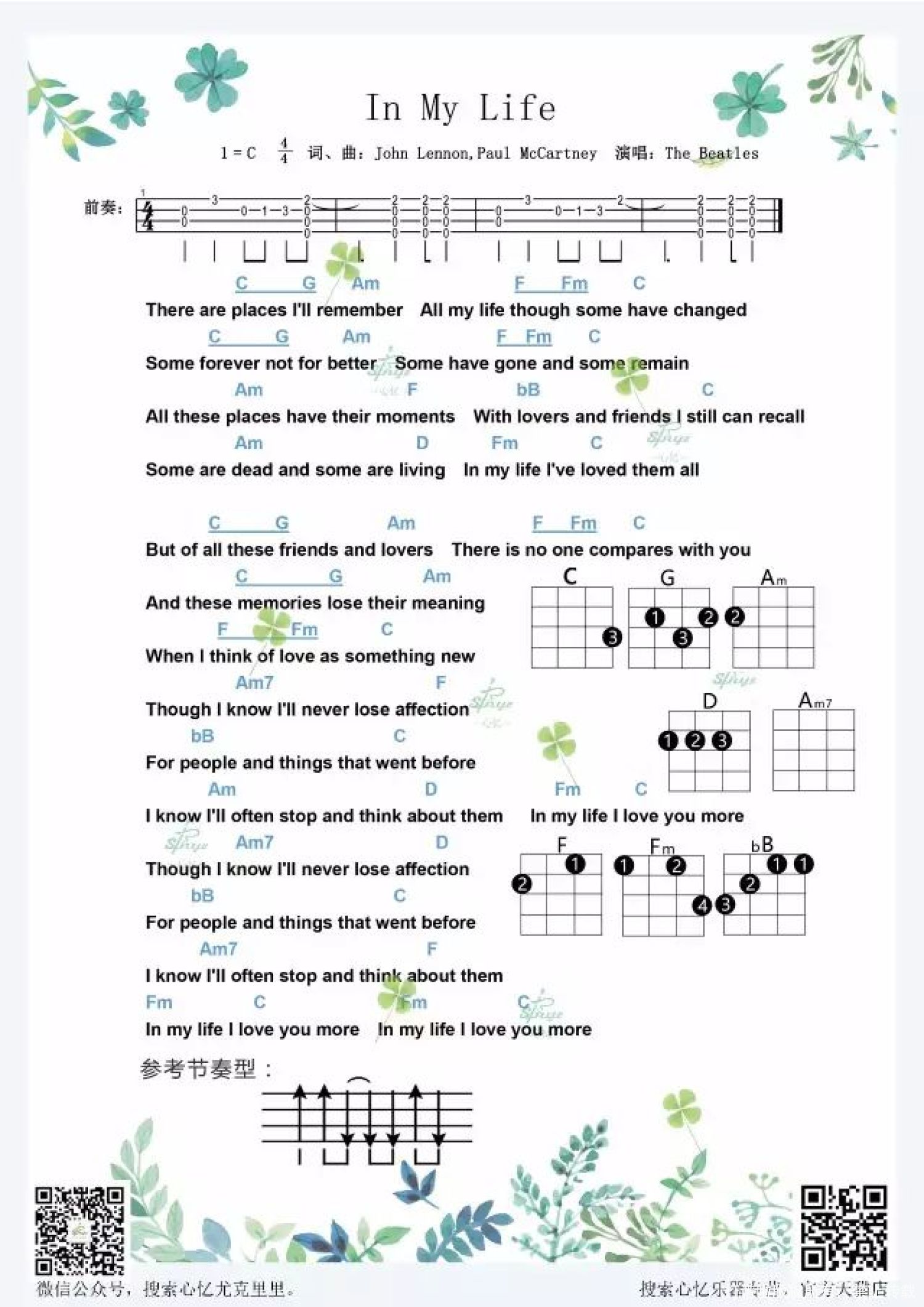 曲谱介绍: In my life,来自甲壳虫乐队的一首老歌,简单的旋律,听着听着就能跟着一起唱了。伴着一段舒缓的吉他声,右耳开始响起合唱“there are places i remember...”,而左耳则是乐器背景音。听起来似乎挺轻松的歌曲,其实却有着让人伤感的故事。希望你喜欢~ 创作背景 这首歌来源于1962年披头士那次永生难忘的痛苦的第三次汉堡之行。 1962年4月10日,在甲壳虫乐队到汉堡的前一天, Stuart Sutcliffe(他是披头士出道之前早期的成员,beatles的名字就是他最先提出来的,他的女朋友阿斯特丽德·科尔什赫(Astrid Kirchherr)设计了披头士经典的蘑菇头发型)在经历了剧烈的头痛后,因脑溢血在汉堡去世。事情经过是这样的:Astrid接到她妈妈的电话说,Stuart Sutcliffe头疼得想从二楼窗户跳出去。 她赶回家, 想把Stu送到医院去,但是在去医院的路上,Stu死在了她的怀中。Astrid到机场去接John、Paul和Pete时,他们的眼睛都红红的。John Lennon在《In My Life》这首歌所写的"With lovers and friends I still can recall,Some are dead and Some are living ",指的就是他死去的好友Stuart Sutcliffe,一个早夭的天才。 这也许就是In My Life听起来如此感人动情的原因吧。 Jake Shimabukuro - in my life 弹唱谱