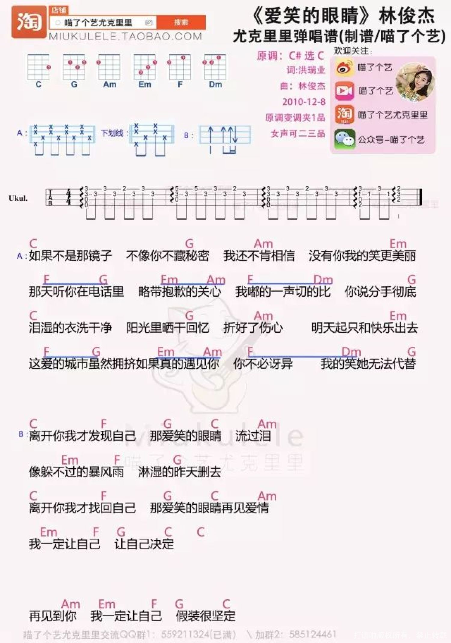 曲谱介绍: 尤克里里COVER 弹唱教学 爱笑的眼睛尤克里里谱