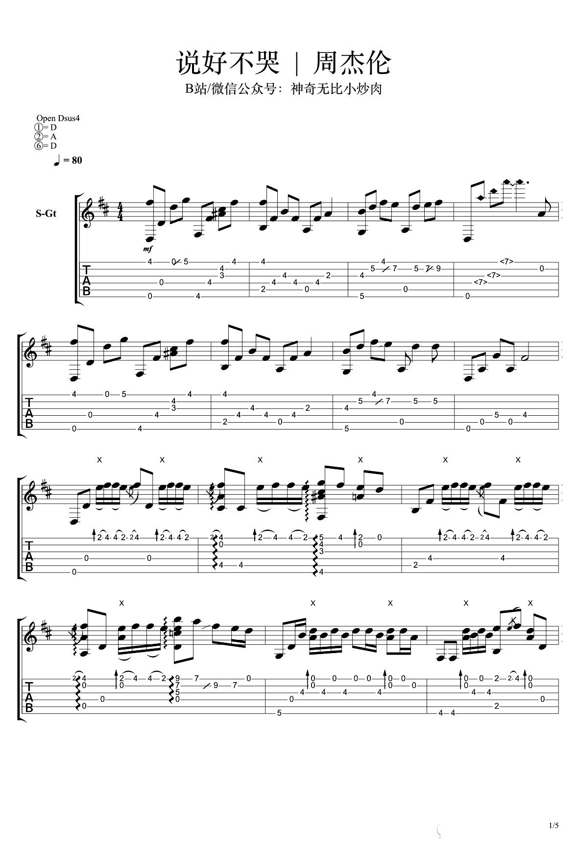 曲谱介绍: 《说好不哭》指弹谱,改编自周杰伦的热门新歌单曲,说好不哭吉他独奏谱,感谢神奇无比小炒肉编配并带来曲谱演奏配套演示,琴谱网为琴友们更新上传。 周杰伦2019最新单曲《说好不哭》 成为全网最热的话题,玩儿指弹的都没有闲着,今天全网首发的这个高质量的演奏视频,来自加拿大的华人——小炒肉的版本。这是一个资深老琴友了,现在B站也是火得一塌糊涂。