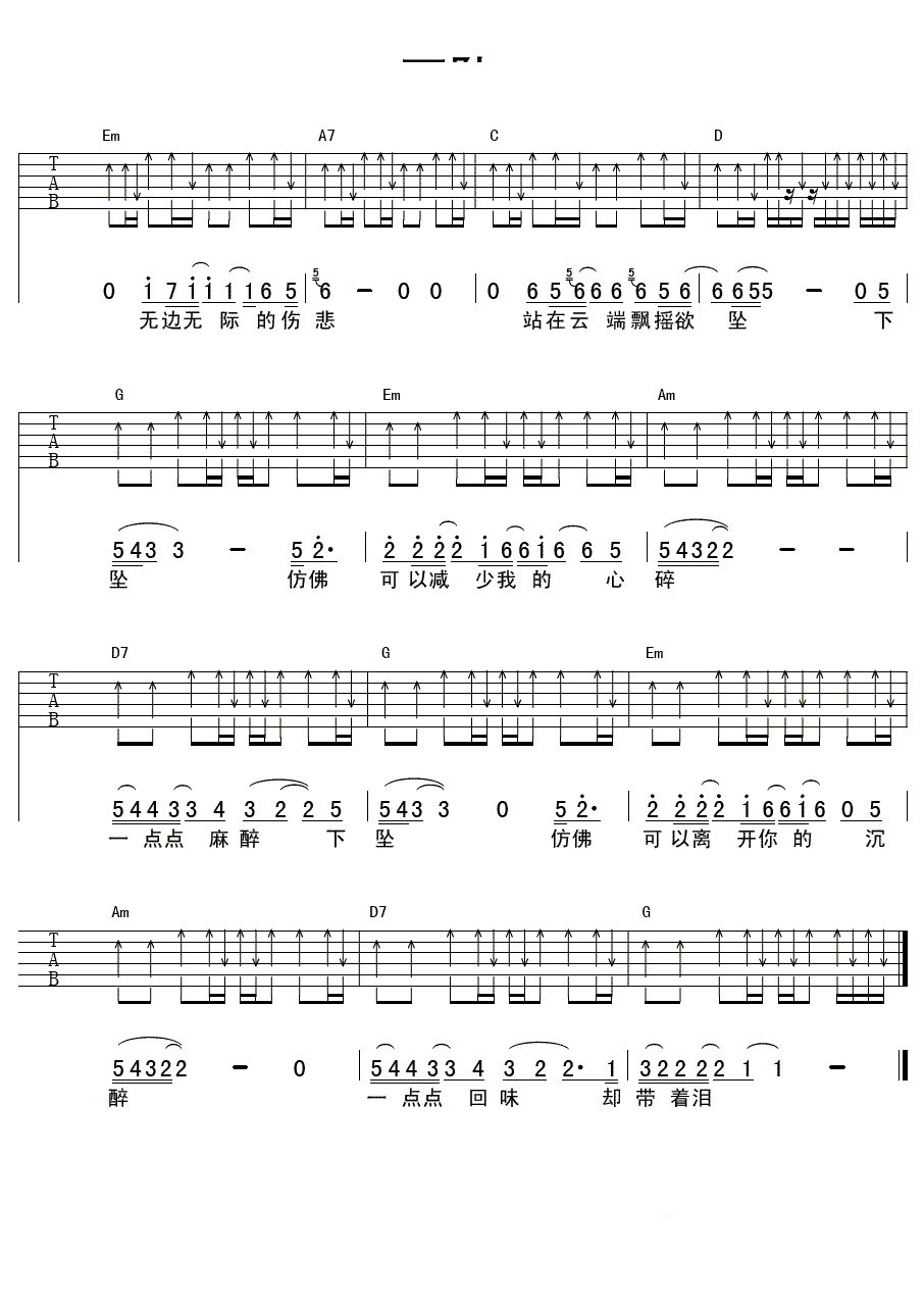 曲谱介绍: 下坠吉他谱,汪峰在湖南卫视《歌手》节目演唱歌曲,《下坠》六线谱,降半音调弦,G调指法简单版,图片谱由延麟编配,琴谱网上传更新,欢迎吉他爱好者收藏分享。 这首时剑波的原创作品,曾经被迪克牛仔翻唱,改名为《可以不流泪》,汪峰充满激情的表演感动无数人,下坠的时候,我们怎么坚守自己内心里的那份矜持与淡定?