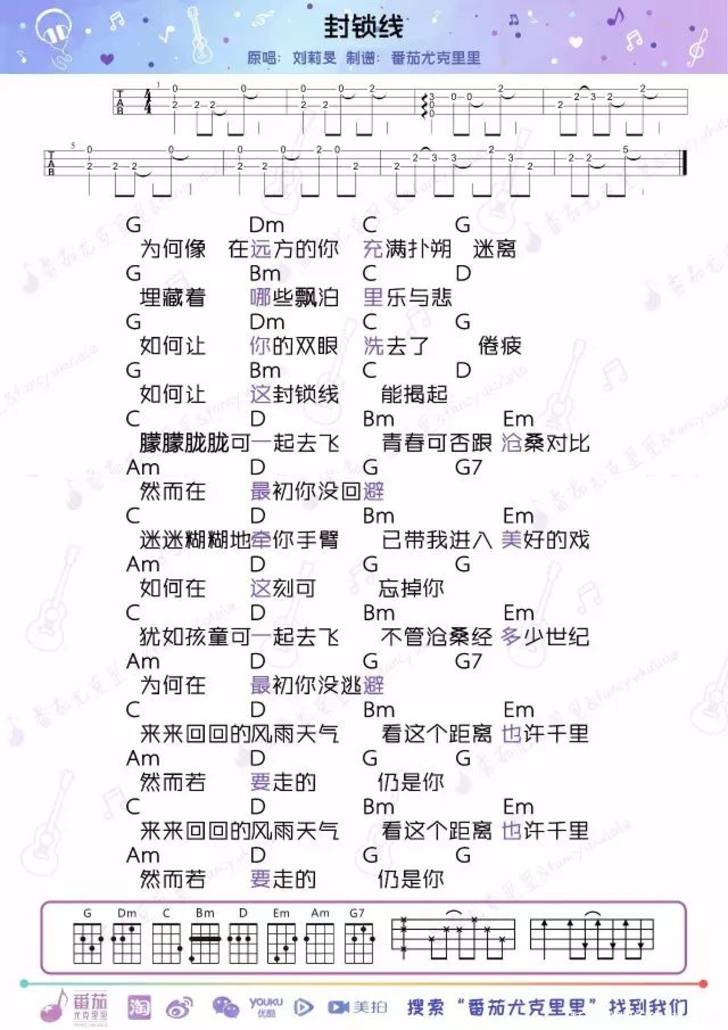 曲谱介绍: 我有一个江湖,但在我心里,它是幼儿园   刘莉旻 广东唱作型歌手、参加过04年超级女声,2014深圳流行音乐节歌手选拔大赛冠军、SZPT新声代流行歌唱大赛冠军、最具人气奖。独立音乐的粤语女声,声音具有个人标识。 牛牛(刘莉旻)在深圳长大,从小就在收音机里听着对岸的电台节目,所以港台流行音乐才是她最初的启蒙。真正接触到民谣是大学去酒吧当驻唱歌手,老板是个民谣音乐人,听她唱完歌后说:“就像一个很干净的姑娘花了脏兮兮的烟熏妆”,后来老师用了很长时间纠正她唱歌时的发音,从那时开始,牛牛开始感受到民谣的魅力。   封锁线 《封锁线》是刘莉旻演唱的一首歌曲,由刘卓辉作词、马条作曲。收录于专辑《拾众而歌·民谣地图》 “听了马条的封锁线觉得想坐在大漠一整夜,一坛酒,足矣。这个版本像是吃醉的旅人走到湖边,月亮漫过肩膀,旅人看见胡杨林中走出一匹猩红色的马,旅人知道有一个姑娘在这等了他一整晚。他无措地抬起脸,天空的云薄薄地烧了个干净,风一吹便散。湖面寂静地泛起了波澜。” ——网易云用户骆驼fafa 封锁线 尤克里里谱