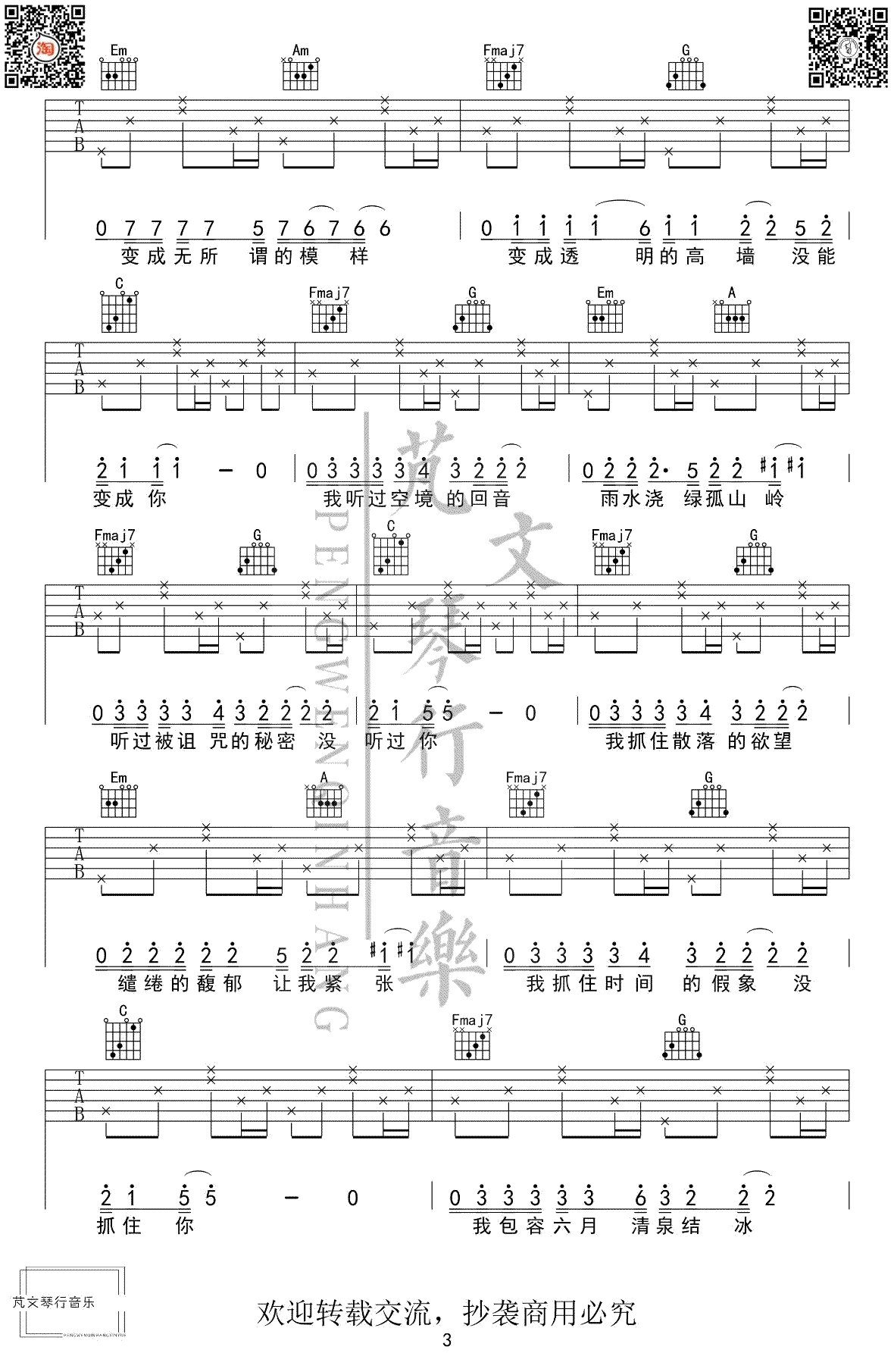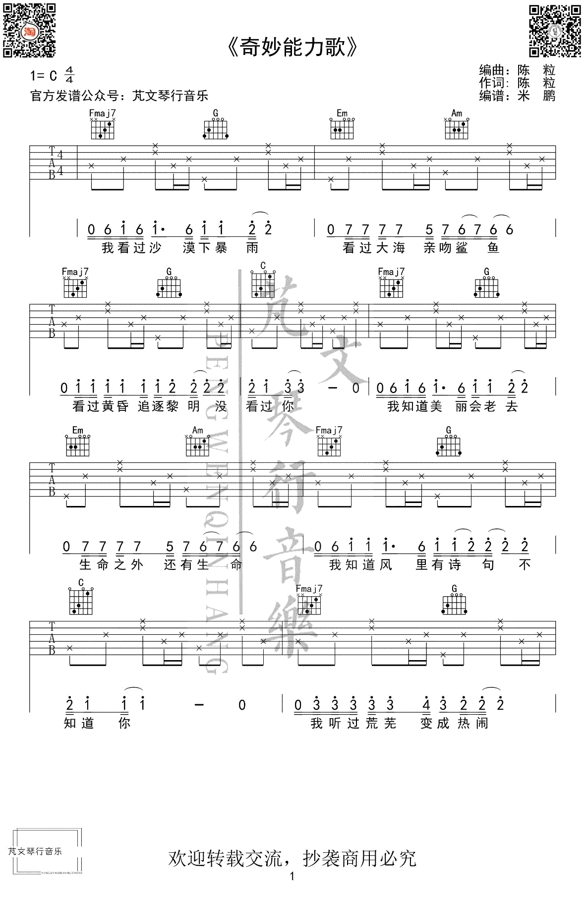 曲谱介绍: 陈粒《奇妙能力歌》吉他谱,选用C调指法,四张图片谱,奇妙能力歌吉他弹唱谱,六线谱由芃文音乐编配分享,琴谱网整理上传。 这首《奇妙能力歌》适合范围较广,因为原版的编配正好不落俗于基础节奏型,又有规律整齐的节奏,陈粒原版也是C调,这种原版就可以作为示范曲例的歌的确不多。整首歌曲除了一个调外音#1,再就是对应这个音所编配的A和弦。这些是我们在弹奏歌曲时应该积累的。不论是音准演唱或者时音响效果的准确把握。