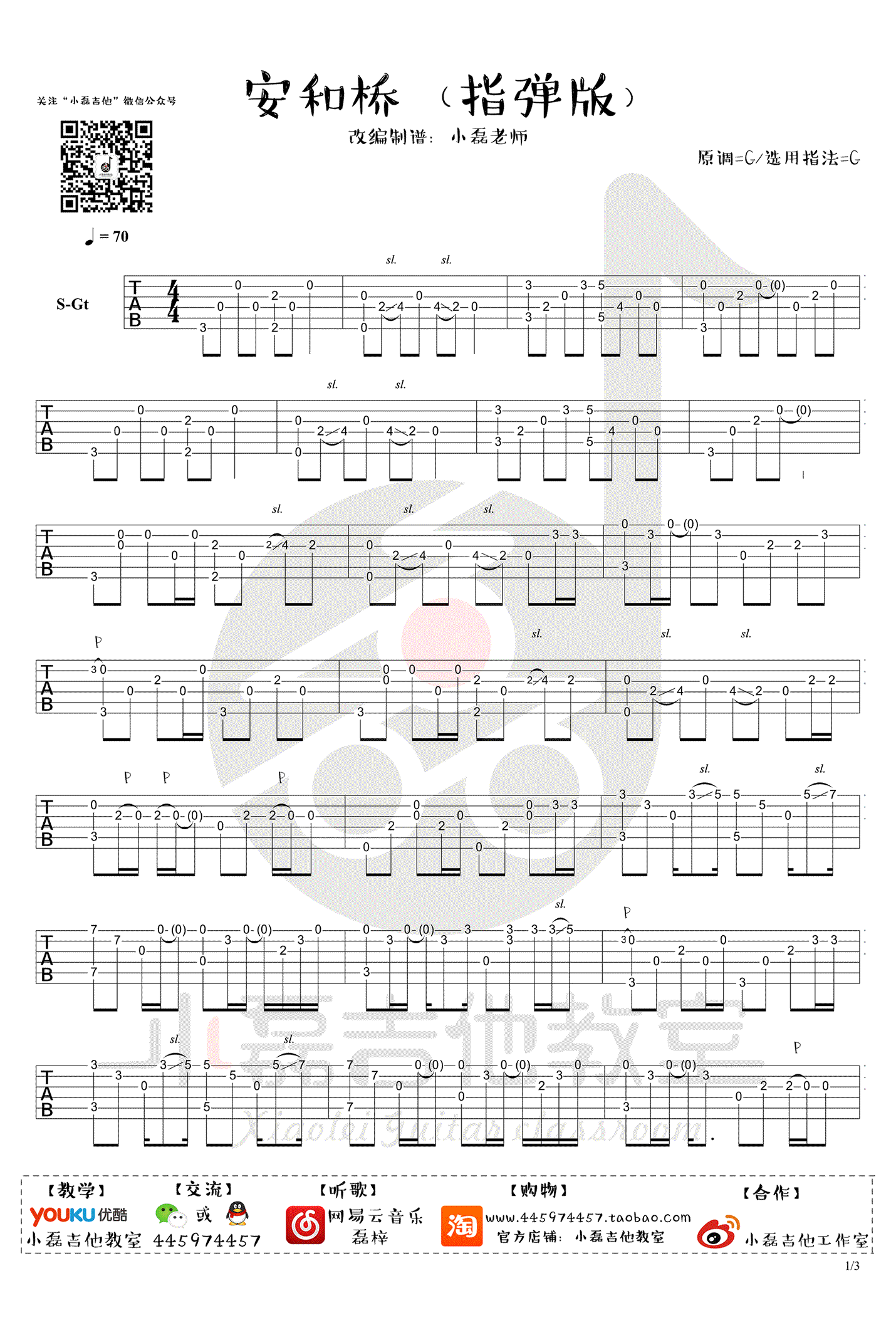 曲谱介绍: 宋冬野演唱《安和桥》吉他谱指弹版,一首经典民谣歌曲,安和桥指弹吉他独奏谱,选用G调指法,难度9级,感谢小磊吉他的编配和提供的示范和教学视频,琴谱网推荐分享。 注意乐谱中的数字所联想到的和弦。节奏不好的同学,一定要仔细练习,因为节奏错误乐曲就全错了!一些演奏技巧,例如勾弦滑音等,和后段我们用到的PM演奏技巧!也是练习的重点!